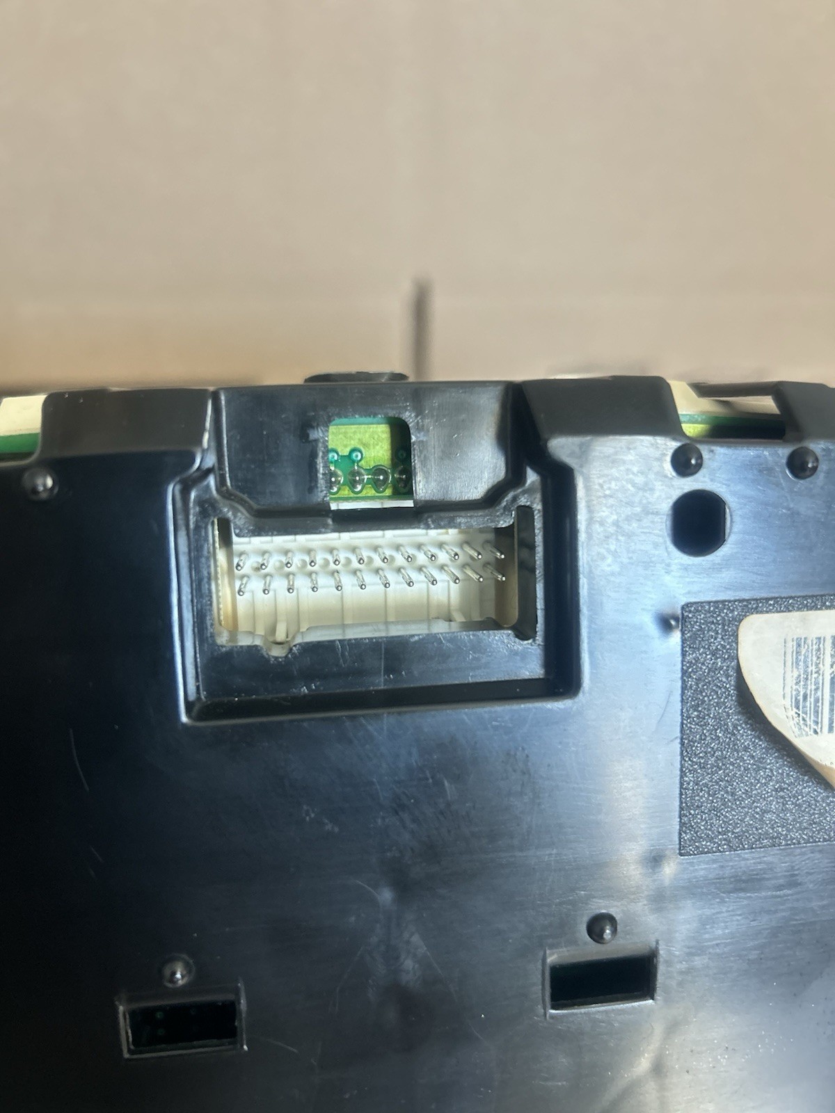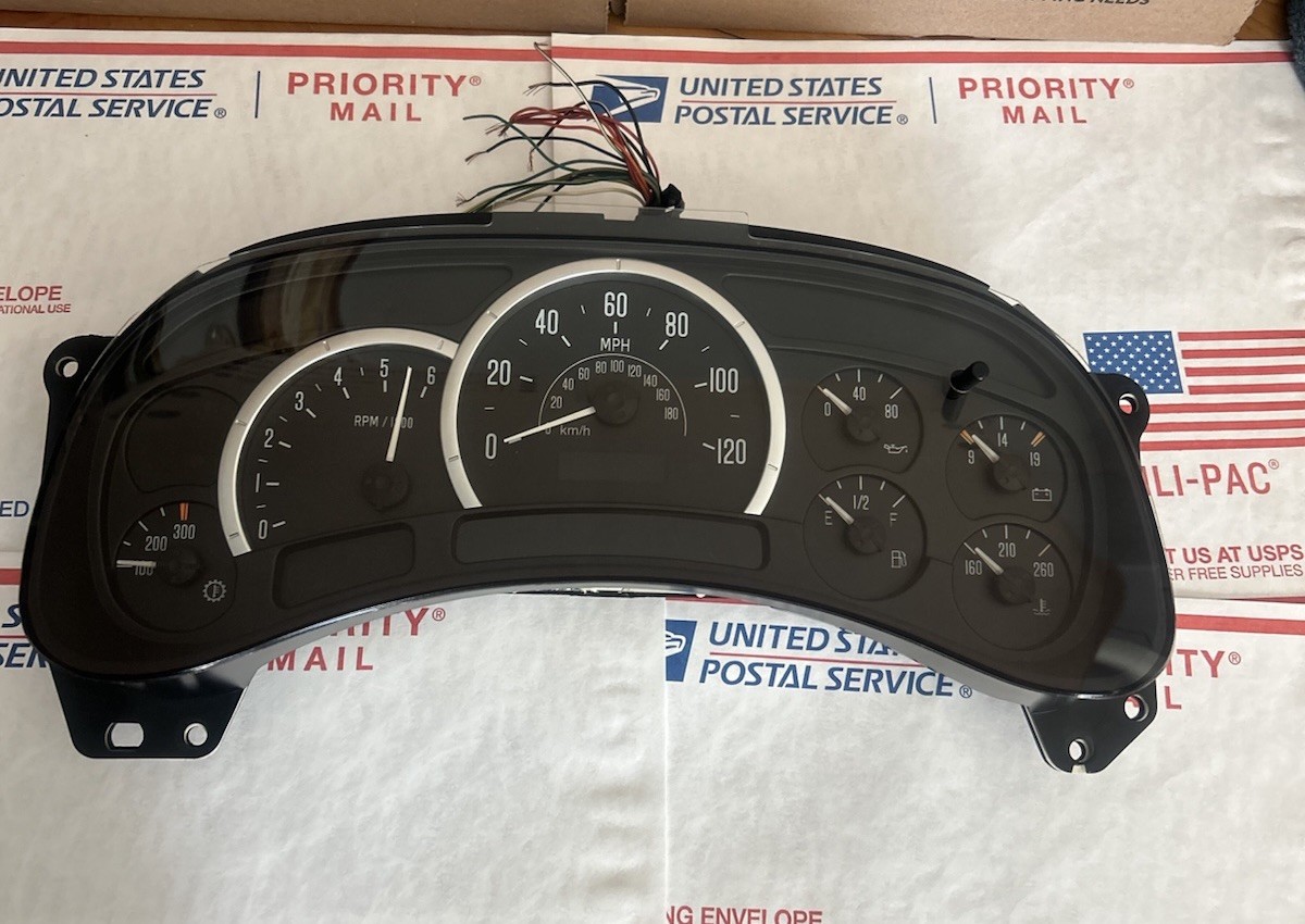 The product is a complete black platinum instrument gauge cluster speedometer for a 2003-2006 Cadillac Escalade. It includes the speedometer, fuel gauge, and is a direct replacement part with a maximum speedometer value of 120 mph. The cluster is illuminated and features both analog and digital display types. It is designed for automatic transmission vehicles and comes with a manufacturer part number and various interchange part numbers for compatibility with Chevrolet, GMC, and other OEM General Motors vehicles. The cluster is made of plastic and has a white needle color.