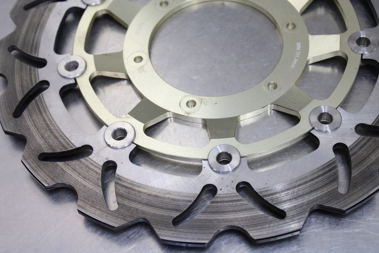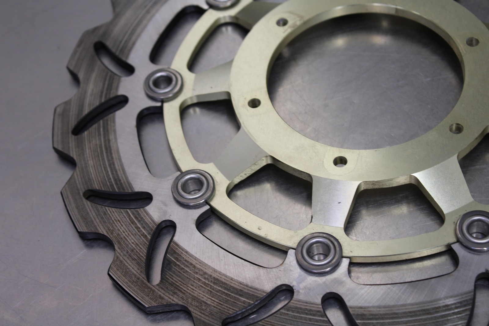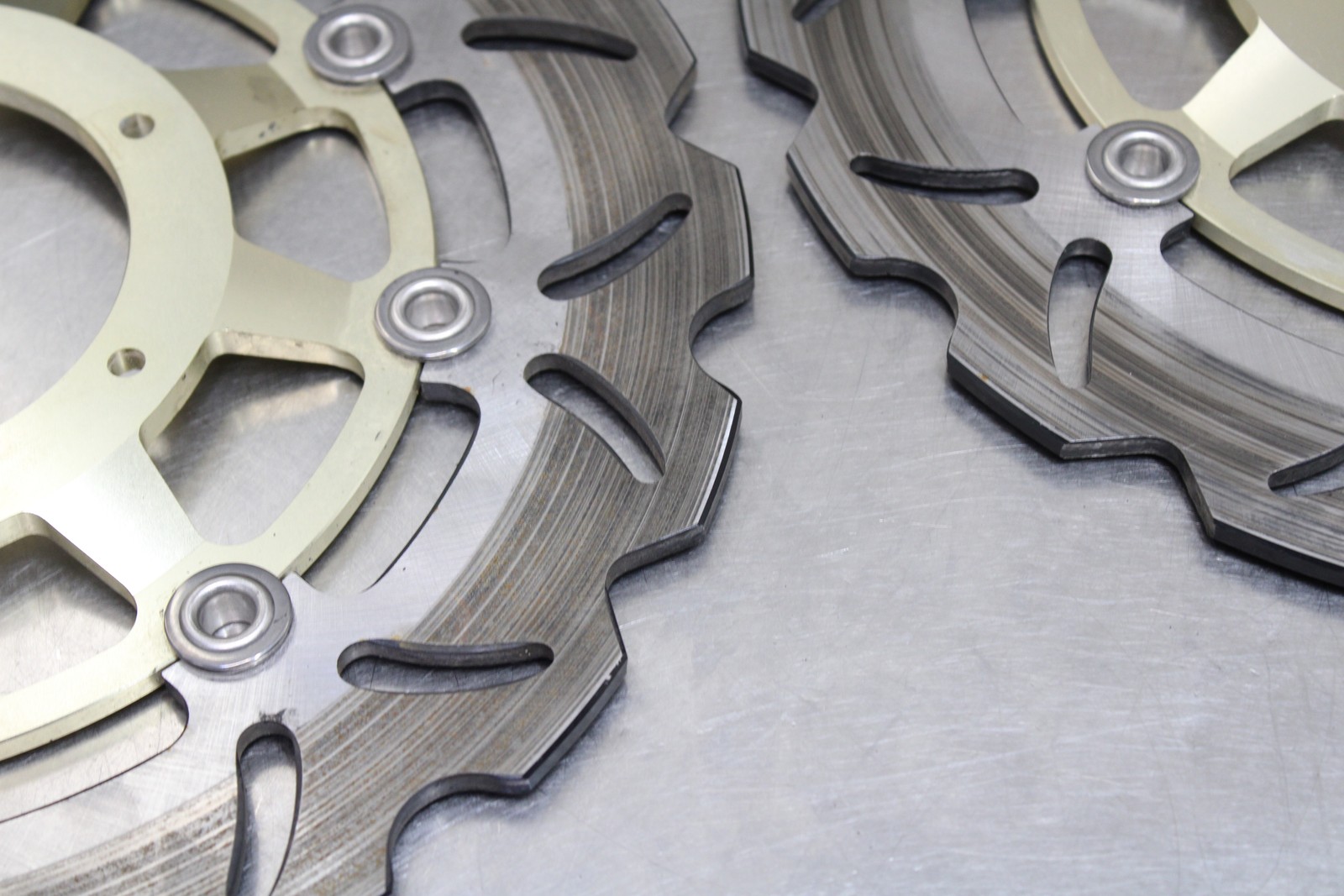 This is a front rotor pair removed from a 2007-2008 Honda CBR600RR. This front rotor pair is in very good condition and shows normal signs of wear.