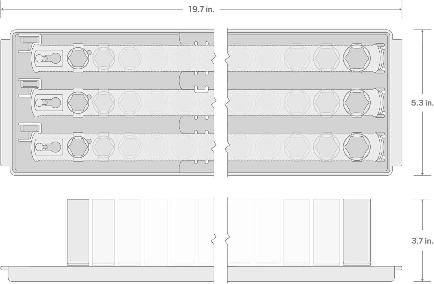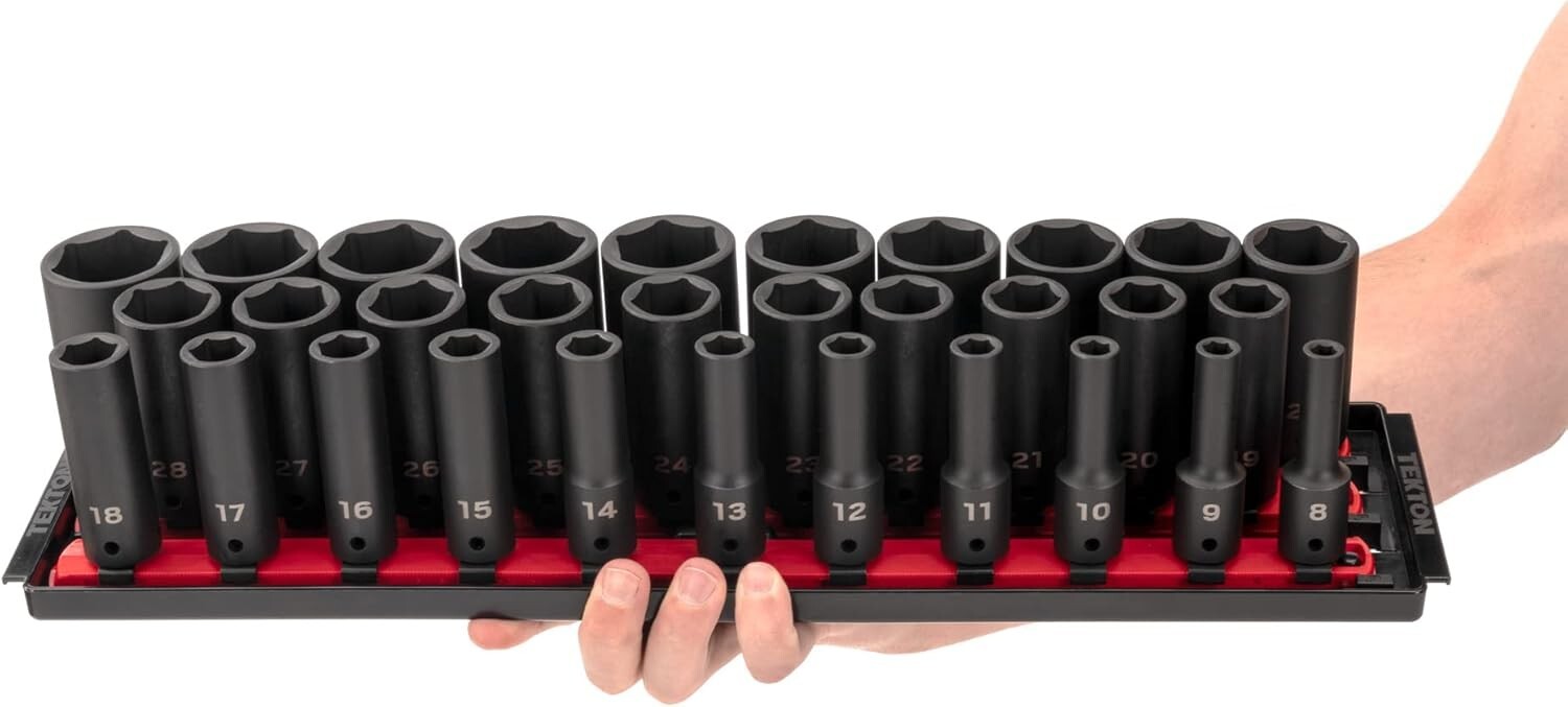 Includes 31-pc. 1/2 inch drive deep 6-point impact sockets: 8, 9, 10, 11, 12, 13, 14, 15, 16, 17, 18, 19, 20, 21, 22, 23, 24, 25, 26, 27, 28, 29, 30, 31, 32, 33, 34, 35, 36, 37, 38 mm; Socket rails and tray