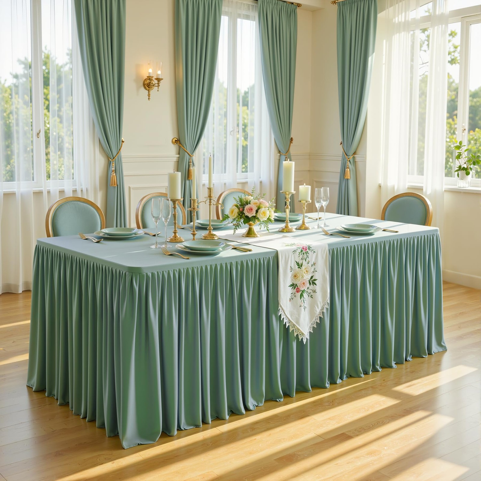 【Simple and Fast Setup】: No velcro, clips, or fasteners are required. Just stretch the sage green table cloth over the table, the table skirt will naturally cover the whole table due to the elastic function of spandex, our sage table covers will fit closely with the table and will not be messy even in the wind. The banquet table skirt comes down to the floor classy looking and it can hide all the items under the table that need to be .