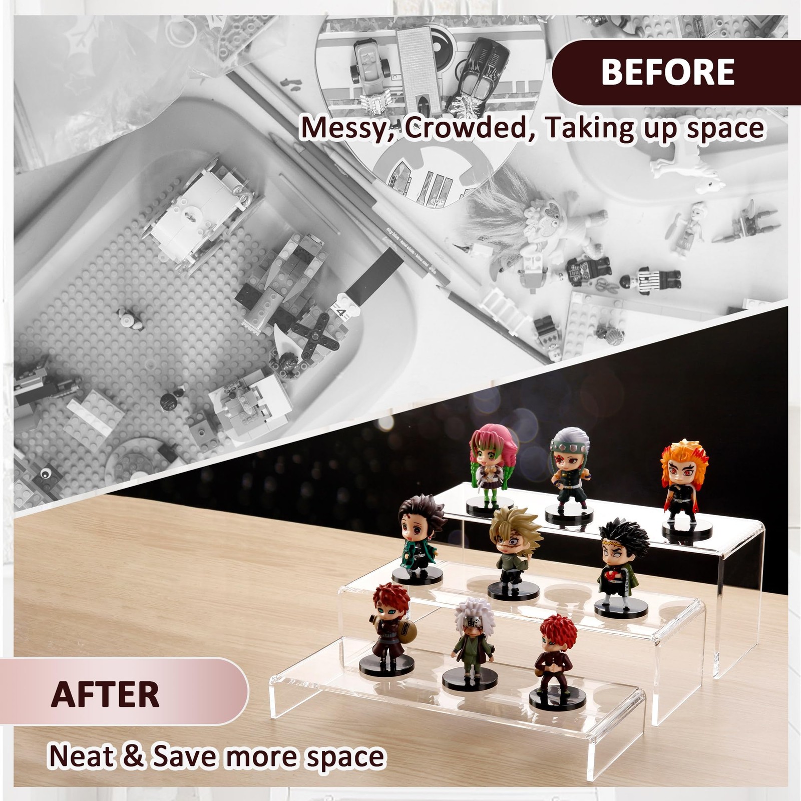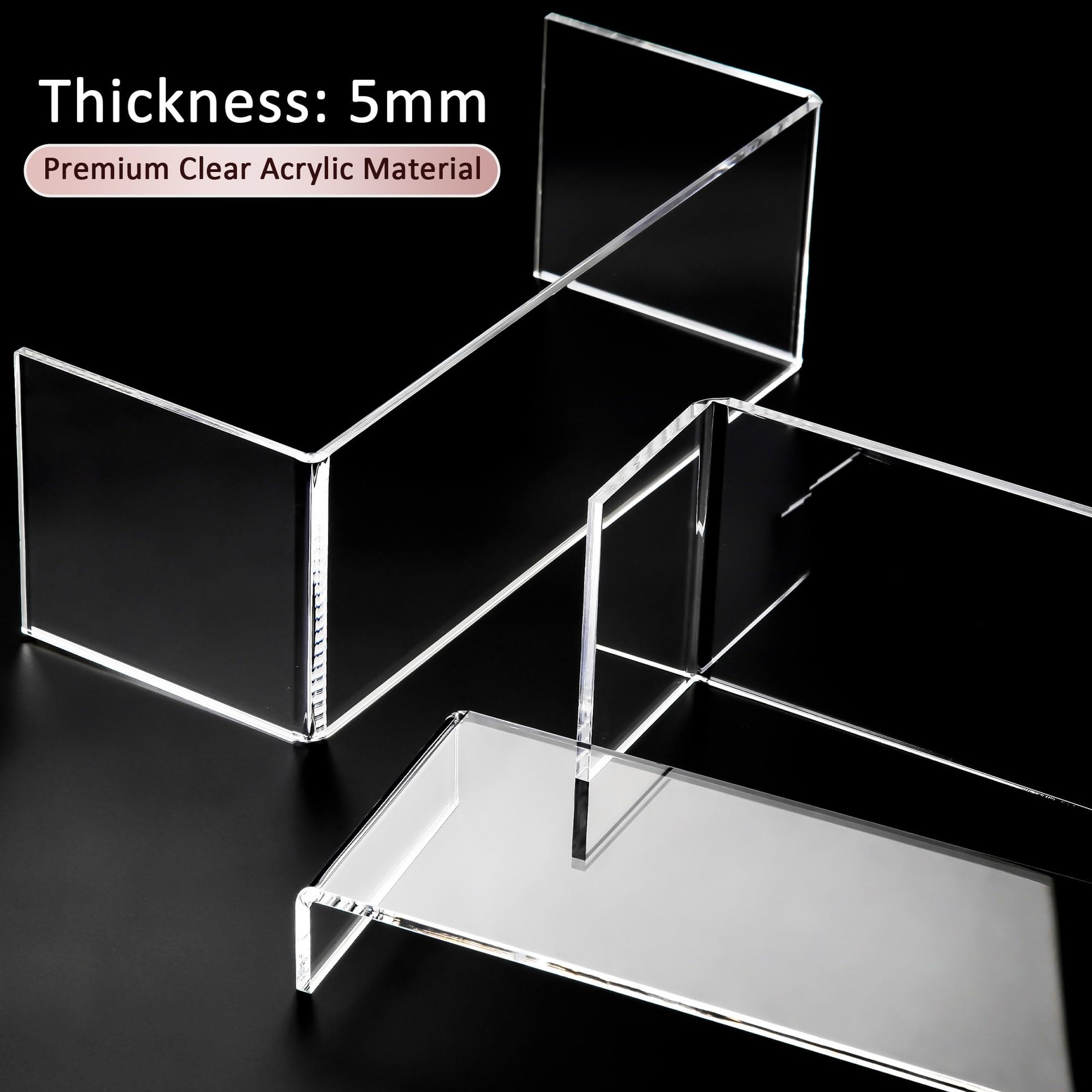 【MULTIPLE DISPLAY LAYERS】 Includes 3 pack of acrylic risers. Available in 3 different sizes (Small: 11" L x 4" W x 1.5" H, Medium: 11.5" L x 4" W x 3" H, Large: 12" L x 4" W x 4.5" H). 3 different heights can be displayed together like steps, or can be arranged individually or staggered. You can use your imagination and combine them freely. 4" width accommodates more and larger items