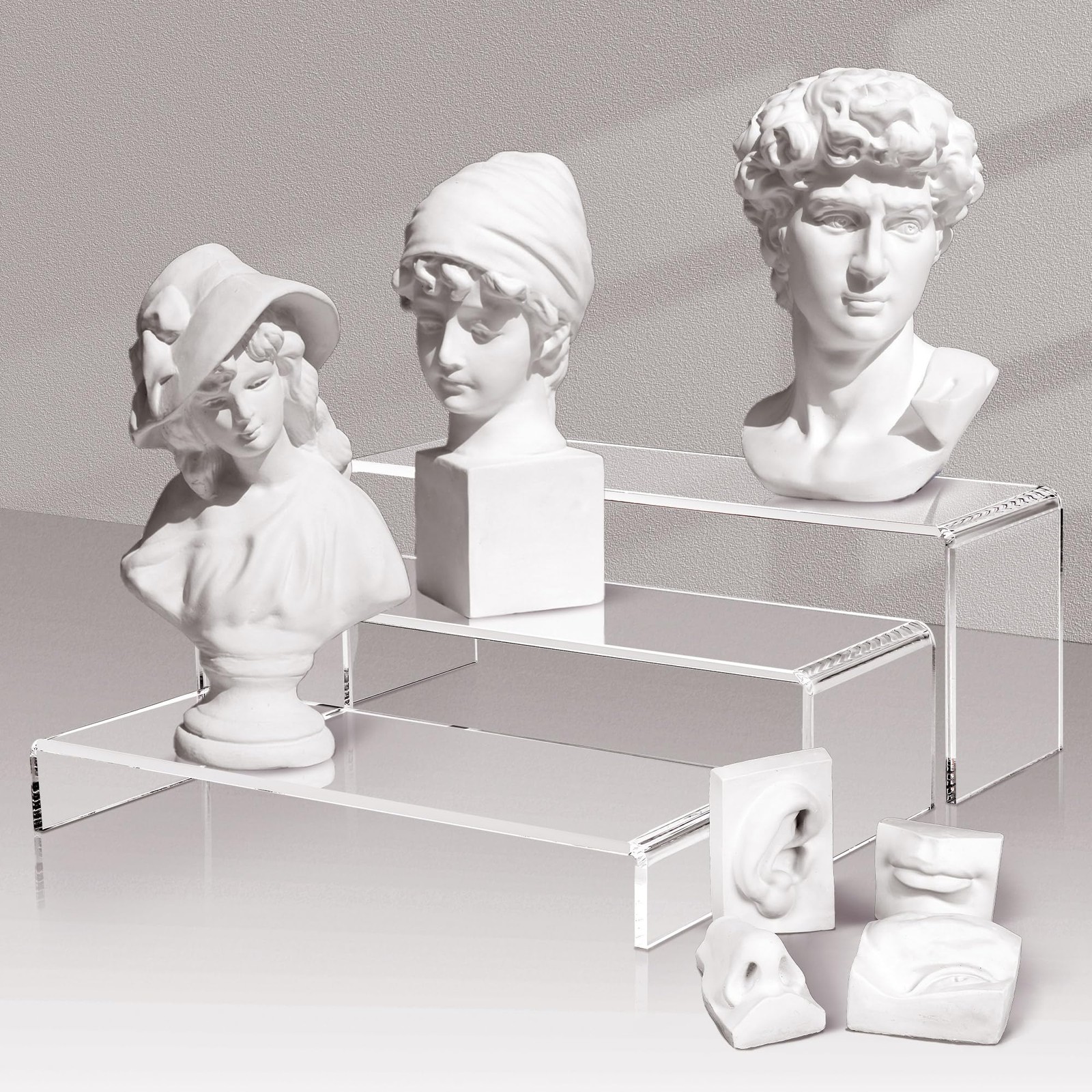 Each acrylic display stand can hold up to 15 pounds of weight, and for the heavy duty porcelain statue series, multiple acrylic risers can help spread the weight of the object.
