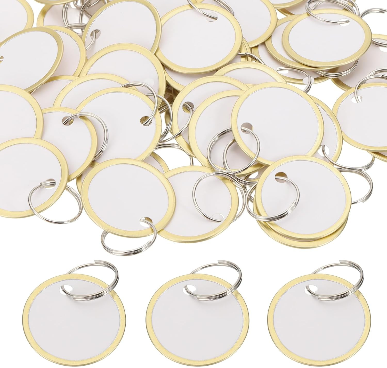 - Easy to Carry: Our blank round paper key tags are great to take wherever you go. 50 pack metal edge key tags are enough to identify your garage, car, bike and door.The key tag is a small hole can be equipped with a key ring, or with cotton thread lanyard