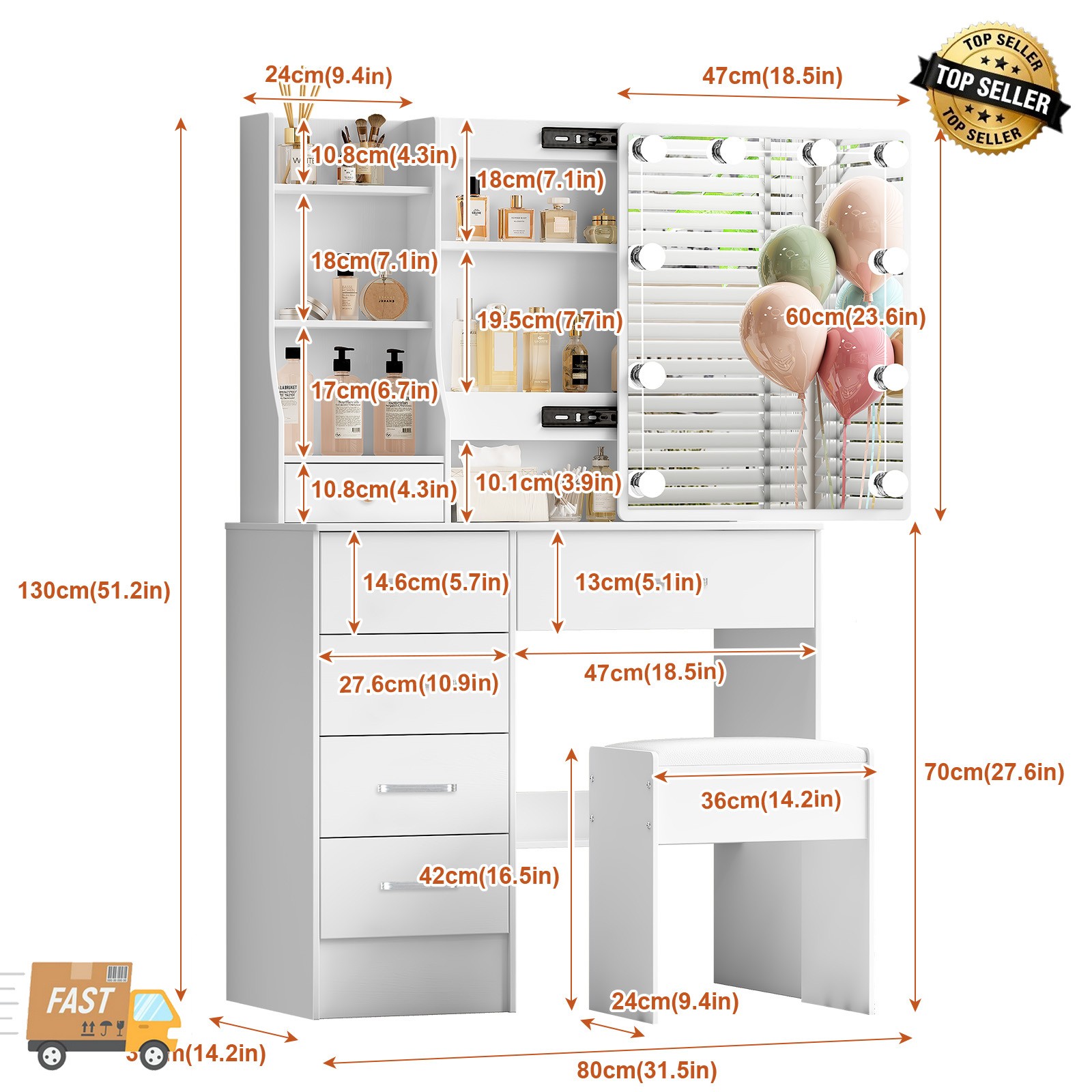 Features: Flat Pack,With Mirror, With Stool