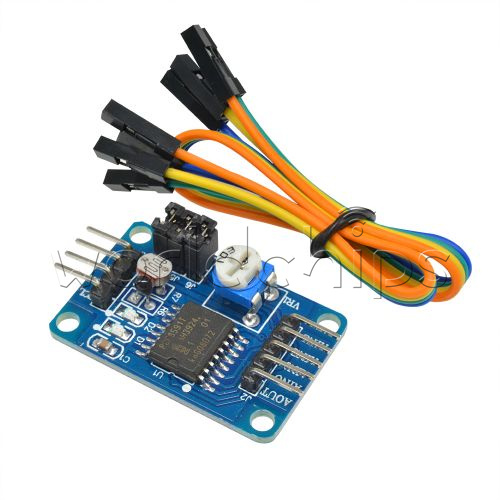 The module's left and right, respectively, the external expansion of 2-way pin interface, respectively, as follows:Output interface of the left the AOUT chip DAThe AINO chip analog input interface.AIN1 chip analog input interfaceAIN2 chip analog input interfaceAIN3 chip analog input interfaceThe right side of the SCL IIC clock interface to access the microcontroller IO portThe SDA IIC digital interface connected microcontroller IO portGND module to an externalVCC power supply interface external 3.3v-5v