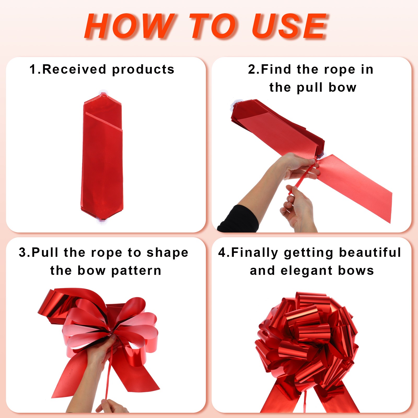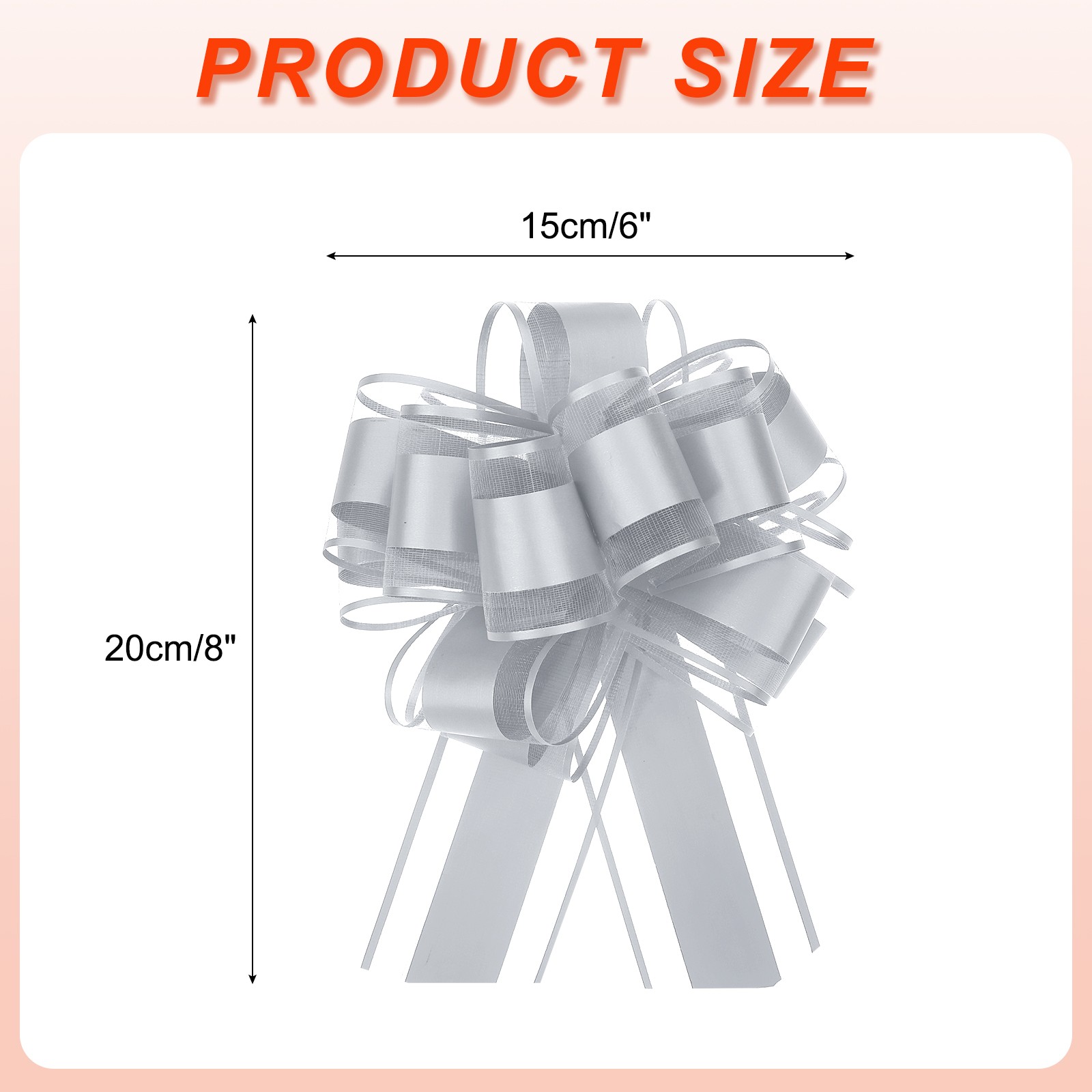 What is this?Iridescent bright colored organza pull bows with ribbons are suitable for wedding car decoration bows, gift wrapping bows, large present decorating bows, DIY crafts handicraft decoration, gift wrapping packaging, holiday decoration, wedding gift baskets decoration, flower design, party decoration, floral bouquet ribbon, scrapbooking, and can be used to decorate Valentine's Day, Christmas, Halloween, Thanksgiving, Teacher's Day, etc.What will I get?Gift wrapping bows, are in size of :15cm/4 inch width, 20cm/8 Inch heightIn the package of: 12pcs x Gift wrapping bowsIs there any advantages of the product?Extra large glitter pull Bow, bright color, beautiful, which plays a good decorative role, especially suitable for holiday, wedding and party decoration, as ribbons and bows for gift wrapping; Sparkling gift big bows for presents, beautiful and elegant, soft, comfortable to the touch, and durableHow to use it?Steps of installation: 1. Select gift wrapping bows with appropriate specification; 2. For gift wrapping, holiday decorationWhat should I notice?Please pay attention to select the gift wrapping bows with suitable specifications