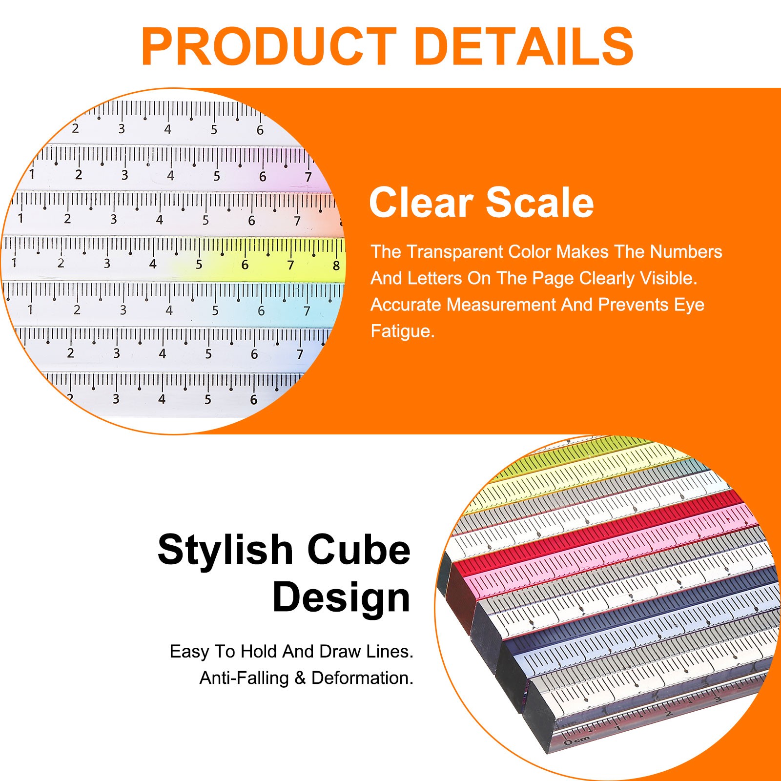 1. This colorful ruler is made of acrylic material, which is sturdy and wear-resistant, drop-proof and shatter-proof, not easy to break and deform, and durable.2. The acrylic ruler has clear and accurate scales, and the transparent color makes the numbers and letters on the page clearly visible, easy to measure.3. The stylish cube design highlights the three-dimensional sense of space, and the gradient color design is layered, easy to hold and draw lines, and is both beautiful and practical.4. The cube ruler is a practical measuring tool that is very suitable for math education, classroom teaching, offices, shops, homes and other occasions. It is suitable for teachers, artists, designers, etc. It can also be used as bookends, decorations or desktop decorations.5. Note: Easy to use, lightweight and portable, it can easily and accurately locate line drawings and measurements. Please confirm the size and color before you purchase.