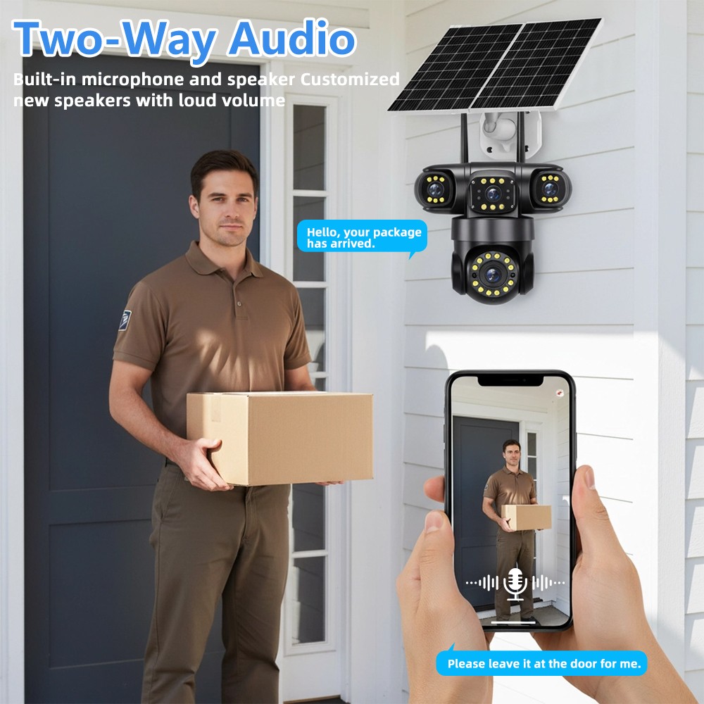 1. Four Lens 16MP Ultra HD: This solar powered security camera outdoor Equipped with four 4MP lense, The 355° horizontal + 90° vertical PTZ (pan-tilt-zoom) allows flexible rotation, combined with digital zoom to cover four key areas at once: courtyard, driveway, and fence etc. Like license plates and facial features are displayed clearly, tripling security efficiency in complex scenarios.