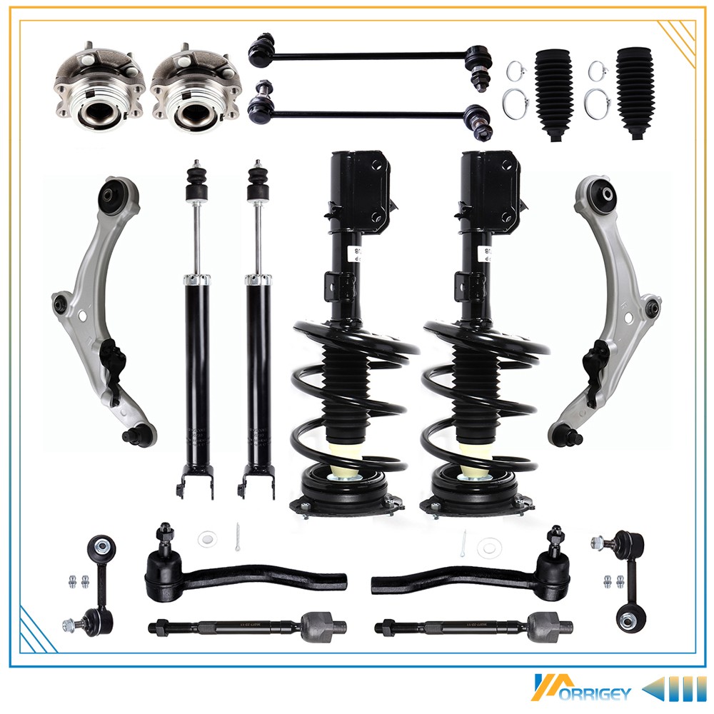 2x Complete Rear Shock Absorbers - 45659 1x Front Complete Strut & Spring Assembly (Driver) - 172605 1x Front Complete Strut & Spring Assembly (Passenger) - 172604 1x Front Stabilizer / Sway Bar End Link (Passenger) - K750094 1x Front Stabilizer / Sway Bar End Link (Driver) - K750095 1x Rear Stabilizer / Sway Bar End Link (Passenger) - K750255 1x Rear Stabilizer / Sway Bar End Link (Driver) - K750256 1x Front Lower Control Arm w/Ball Joint (Passenger) - K622054 1x Front Lower Control Arm w/Ball Joint (Driver) - K622059 2x Front Inner Tie Rod End Links - EV800770 1x Front Driver Side Outer Tie Rod End - ES800357 1x Front Passenger Side Outer Tie Rod End - ES800358 2x Front Wheel Hub and Bearing Assembly - 513296