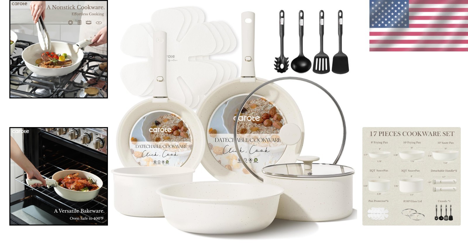 17-Piece Nonstick Cookware Set with Removable Handle - Induction & Oven Safe