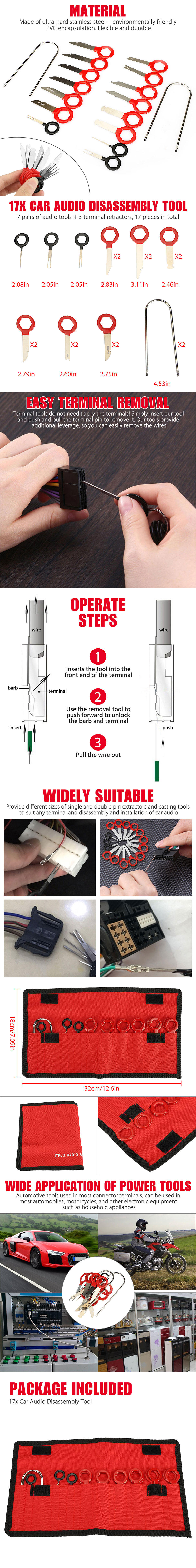 ✨Packing: 7 pairs of audio tools + 3 terminal retractors, 17 pieces in total. Provide different sizes of single and double pin extractors and casting tools to suit any terminal and disassembly and installation of car audio