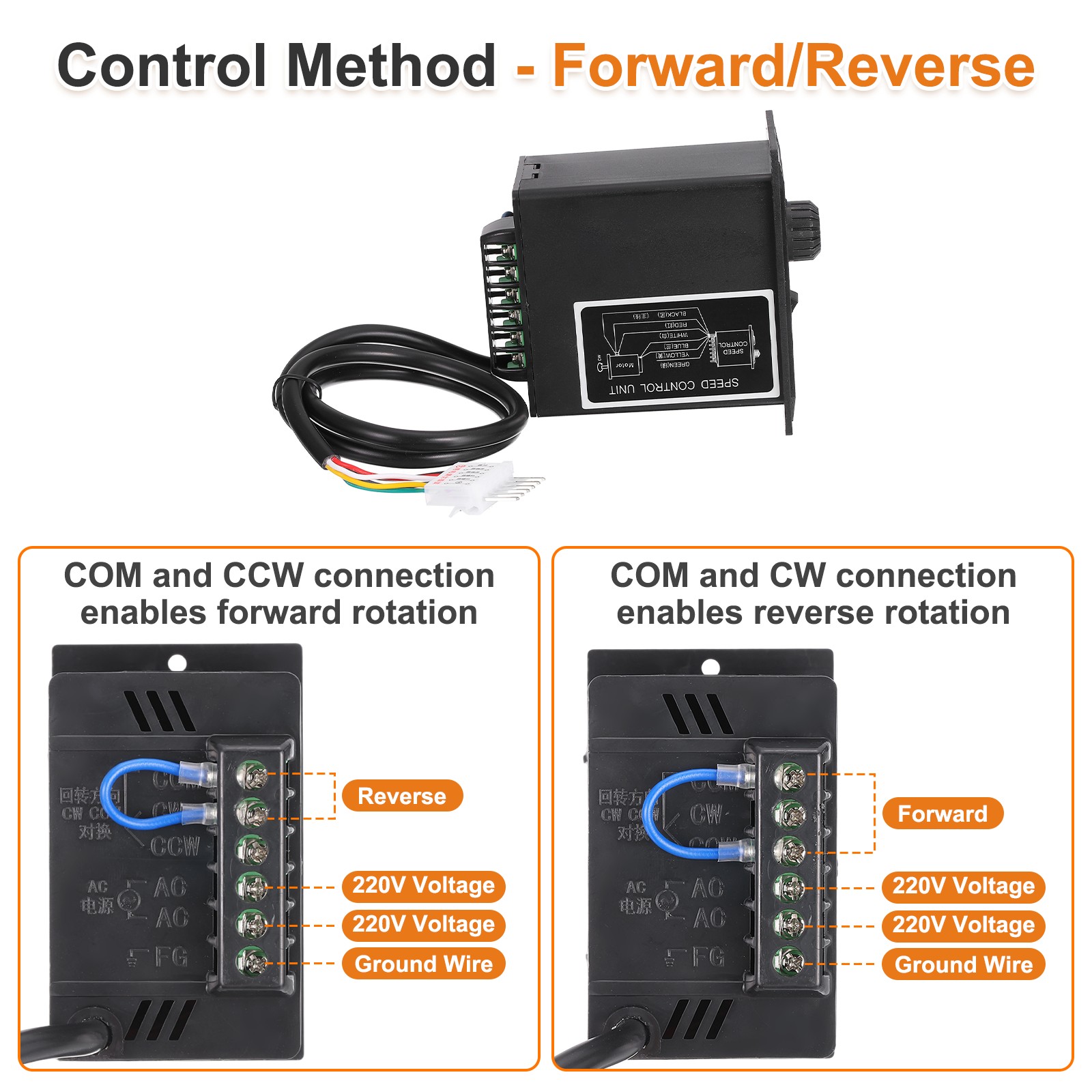 During installation, simply secure the speed control switch using the screw holes on the panel (screws not included). Connect the AC power input cable and motor output cable to the corresponding ports, and connect the motor's plug to a compatible socket or control circuit. COM and CCW connection enables forward rotation; COM and CW connection enables reverse rotation.