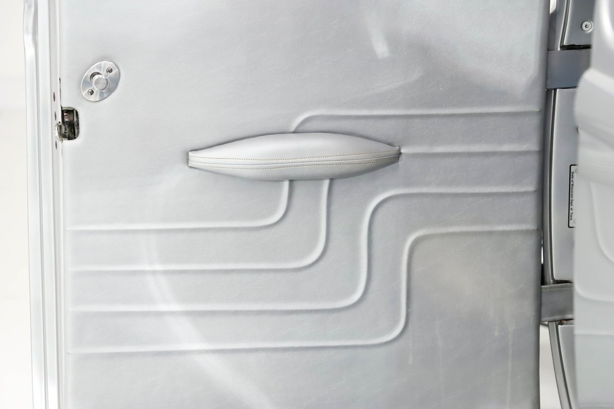 TRUNK COMPARTMENT: The trunk is fully finished and features a power-lift lid operated by a billet hinge. Inside, everything is completely upholstered-including the underside of the trunk lid-in silver with matching blue racing stripes. It has a carpeted floor, interior lighting, and a custom fuel cell, all neatly integrated for a clean, show-quality look.