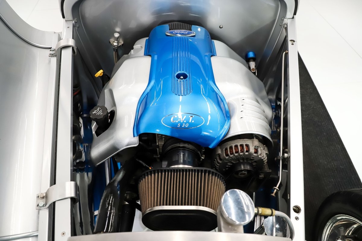 ENGINE COMPARTMENT: Powering this hot rod is a fuel-injected 5.3L V-8 topped with a custom engine cover painted to match the car. It's equipped with coated headers and a full serpentine belt system for reliability. An AutoRad aluminum radiator paired with a big electric fan keeps everything running cool. The engine bay itself is impressively clean and uncluttered, featuring mirrored side panels, a smooth firewall, and a show-quality finish that really highlights the drivetrain.