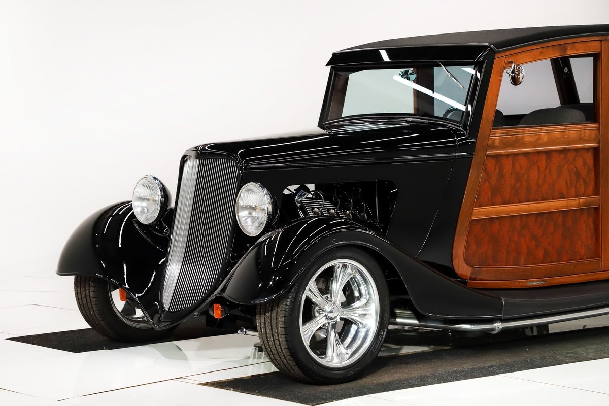 EXTERIOR: Rare walnut body with Kewazingo inserts. The woodwork is solid and has a beautiful glossy finish. The doors use piano hinges for a solid and square fit, they shut like a regular car. The black painted surfaces are laser straight and have a mirror reflection. The padded top is finished in a rich black cloth. The glass is all smoked, the doors even have power windows! I love the big original style headlamps with Ford script lenses, the front turn signals are inconspicuously mounted under the fenders. In back it is using original style taillights along with flush mounted LED brake lights in the body. Those aren't the only flush mounted lights, there are some under the doors that light up when you open the doors with the hidden levers. How about the 4 individual side pipes showing under each fender! It is rolling proud and pretty on the Boyd's wheels: 17s in front, 18s in back and they are wearing Pirelli P Zero tires.