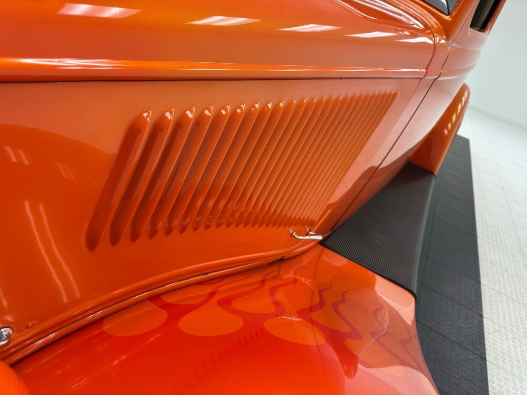 Nicely crafted molded fiberglass curved lines are presented throughout this car uniformly painted in the best named paint, Oh So Sexy Orange. Darker orange flames start just behind the puzzle shaped grille shell and lick their way rearward, while others flicker over the front fenders. This 3 window coupe has been chopped and shaved and has heavily louvered engine covers while a shield shaped grille with vertical ribs curves downward to join gull wing shaped fenders. These join with running boards on either side and then into the rear fenders which go with the flow of the trunk and back of this rodder where LED slit style lights line the bottom. Shiny 16 and 17-inch American Racing Torque Thrust wheels carry staggered size tires. Finally, Ford is imprinted in ghost like paint on the rear decklid and we could not find any exterior imperfections on this beauty.