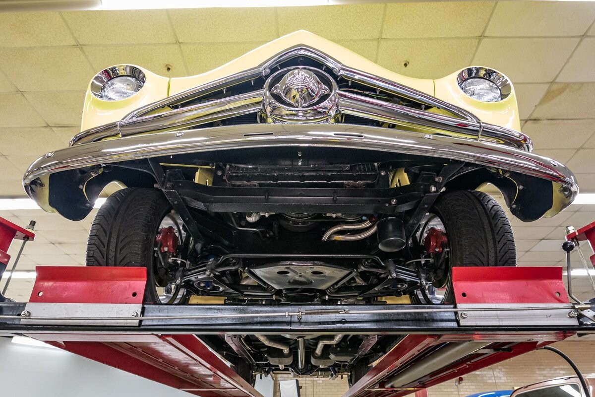 This stunning 1950 Ford Custom street rod has received a top-shelf restoration that includes a broad range of mechanical enhancements. Its custom yellow finish is accented by 18" Foose chrome alloys that mount Michelin Pilot Sport performance radials. The smart Brown/Cream leather is as well-designed as it is stunning. Features include A/C, comfortable bucket seats, center console, Lokar billet shifter, tilt-Grant wheel and power trunk release. The updated dash incorporates a Haneline V-2 'vintage-look' gauge cluster and sounds are furnished by a Sony AM/FM/CD sound system. The trunk has also been beautifully finished out in leather upholstery.