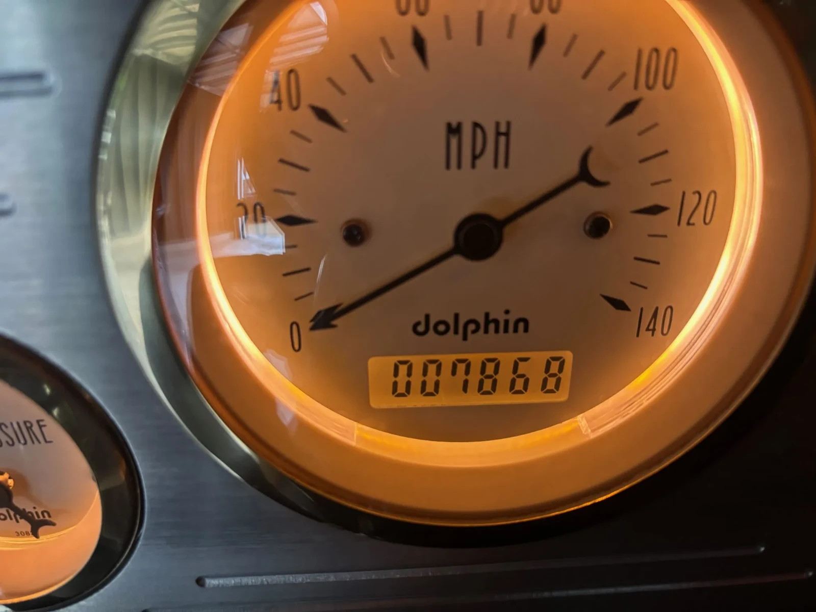 The banjo-style steering wheel is mounted to a tilting column and frames a set of Dolphin gauges consisting of a 140-mph speedometer and readouts for voltage, oil pressure, water temperature, and fuel level. The digital odometer indicates 8k miles, which is the distance driven since the build was completed.