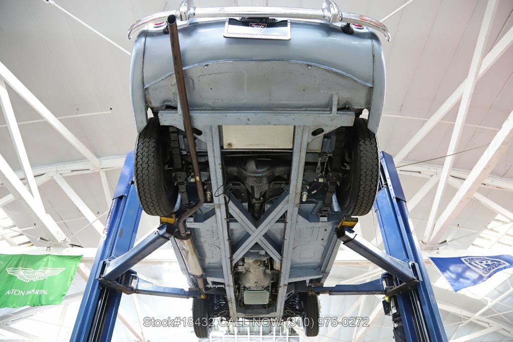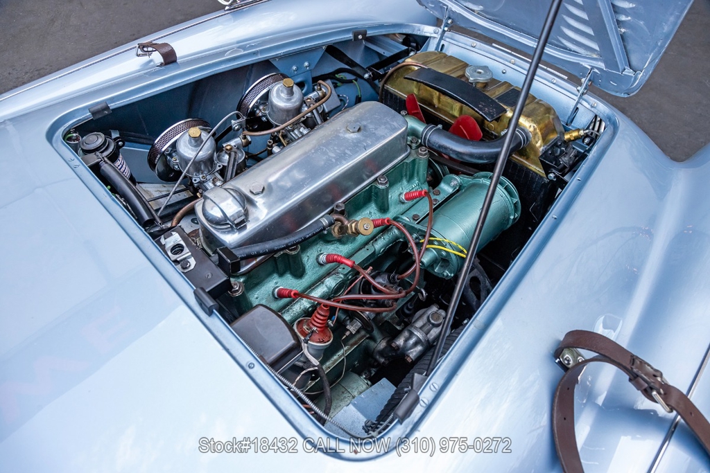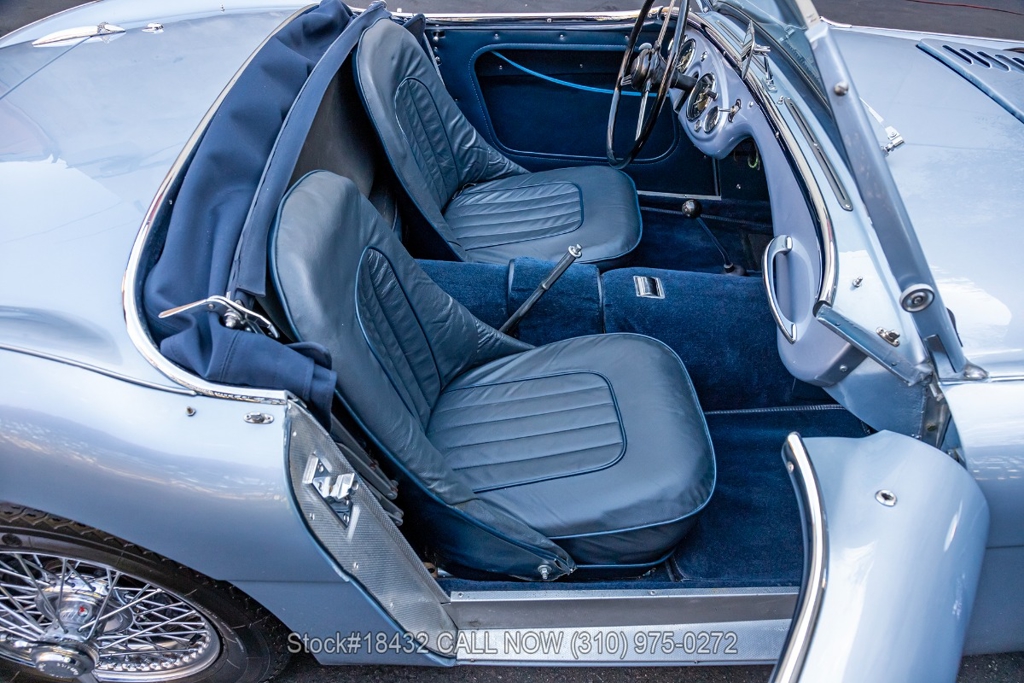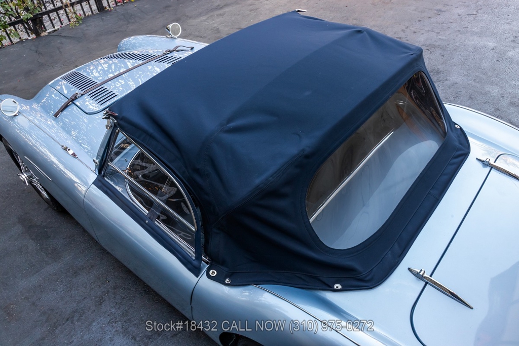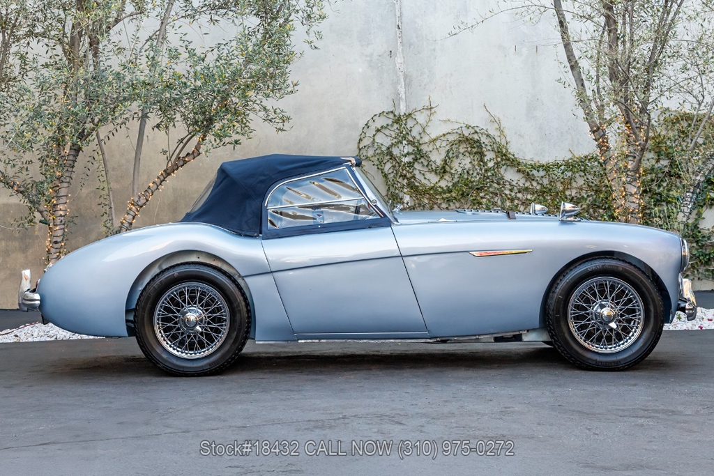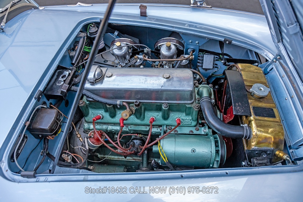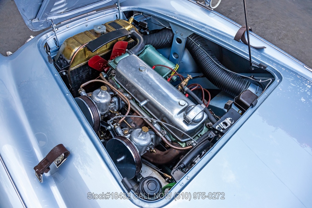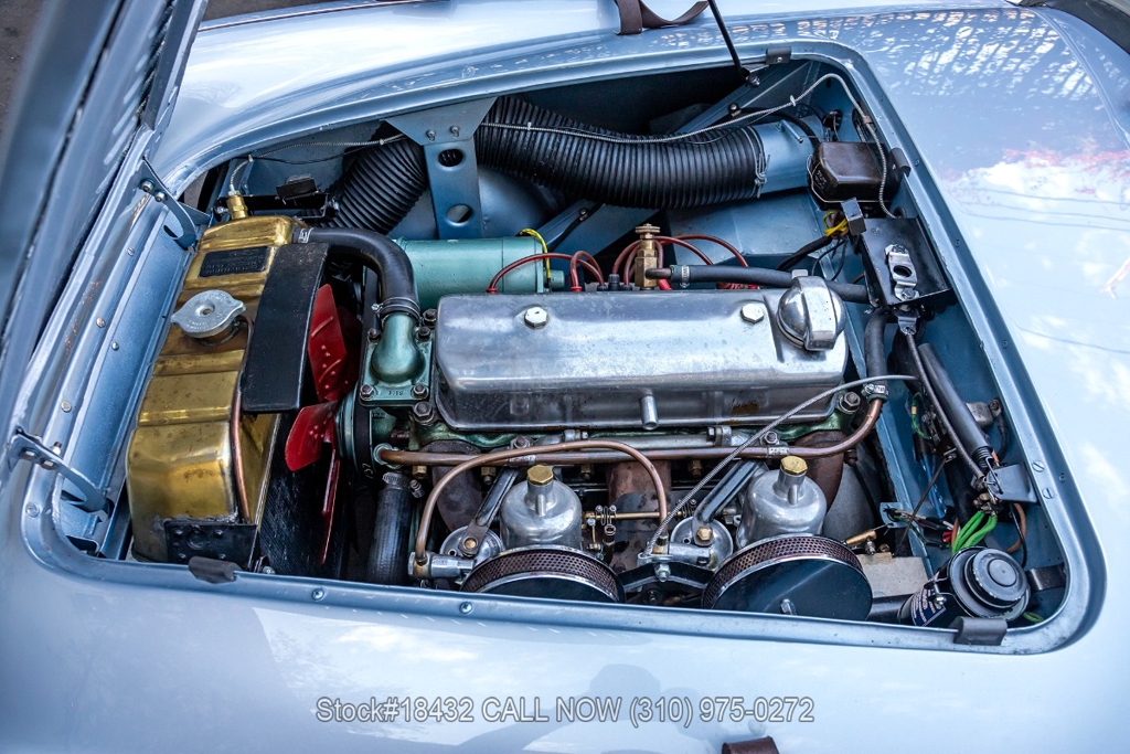 Under the bonnet, this Austin-Healey is powered by an inline-four engine, SU dual carburetors, and a manual transmission. Additional equipment includes floor-mounted shifter, single exhaust outlet, Lucas branded fog lights/taillights, Smiths instrumentation, convertible soft top, chrome trim, Sprint Classic tires, and 15-inch wire wheels with knock-off spinners. Convenience features include dual-side rearview mirrors, hood strap, buckets seats.