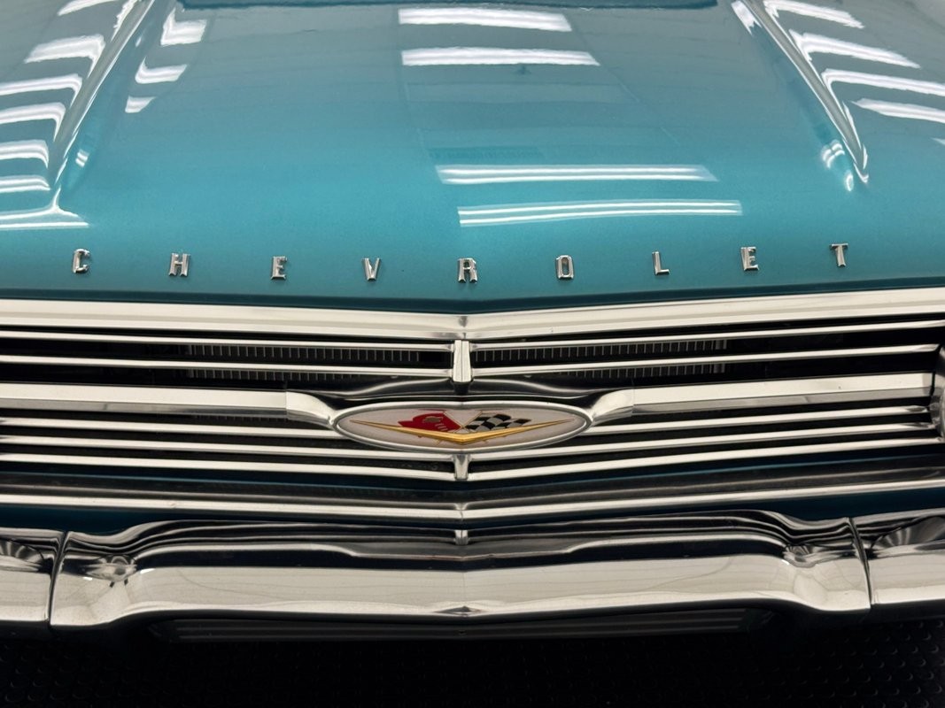 Turquoise and white houndstooth inserts dress up the door panels that include turquoise vinyl panels, polished trim, and a bold red and chrome accent piece and both present cleanly. That houndstooth reappears in the inserts of the split bench seat, framed in vinyl panels and mirrored on the bench seating in back, and all are show quality. Talk about a show, the bright blue steering wheel with the boomerang horn ring fronts a dash that layers shiny turquoise around five gauges and perforated stainless steel around the knobs in the mid dash. There's an AM radio on board and Impala rubber mats protect the looped turquoise carpet below, both in great shape. The angled shaft of the shifter results in the ball knob reaching the driver at the perfect position as it rises from the floor. The trunk is pristine looking with a vinyl mat covering wall to wall and a matching white wall tire spare secured to the floor with a stock style jack.