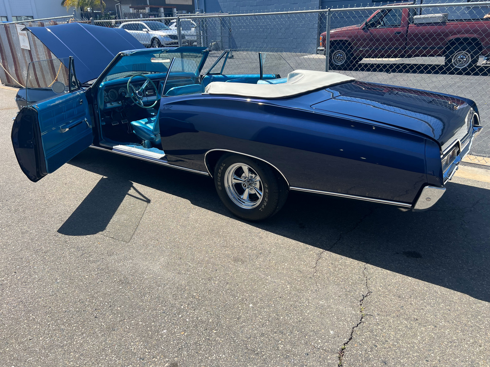 ITS DARK BLUE METALLIC PAINT HAS BEEN BUFFED TO A NICE SHINE AND HAS A GOOD ORIGINAL LIGHT BLUE INTERIOR