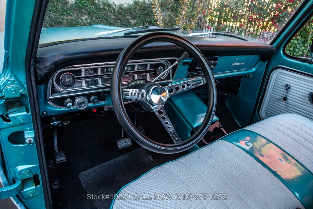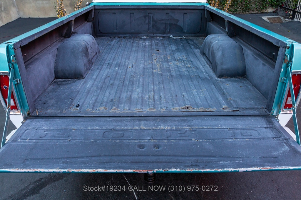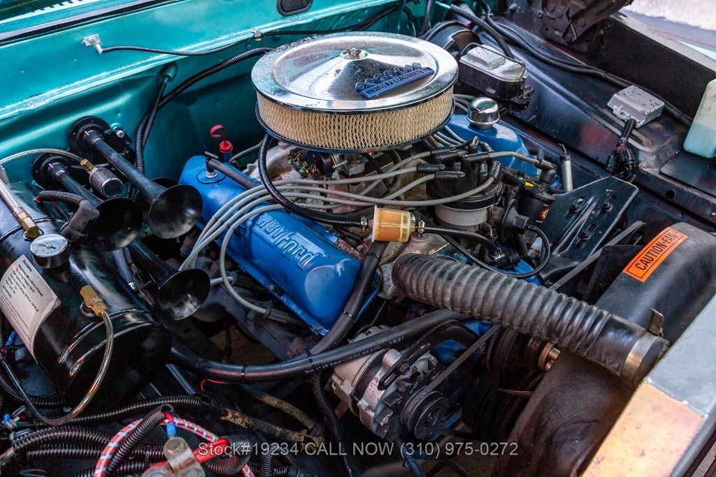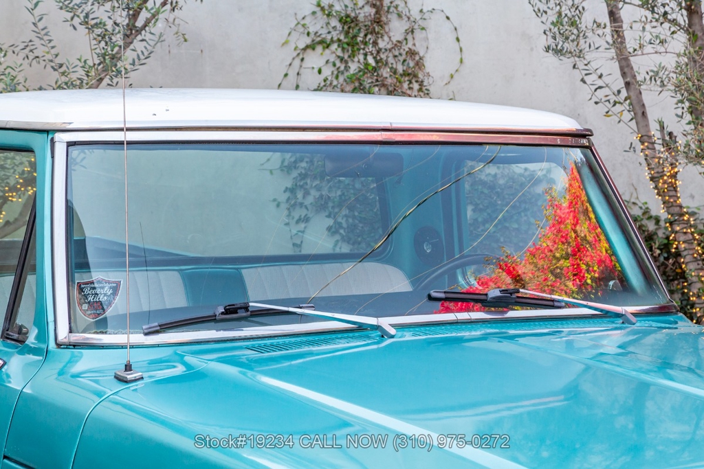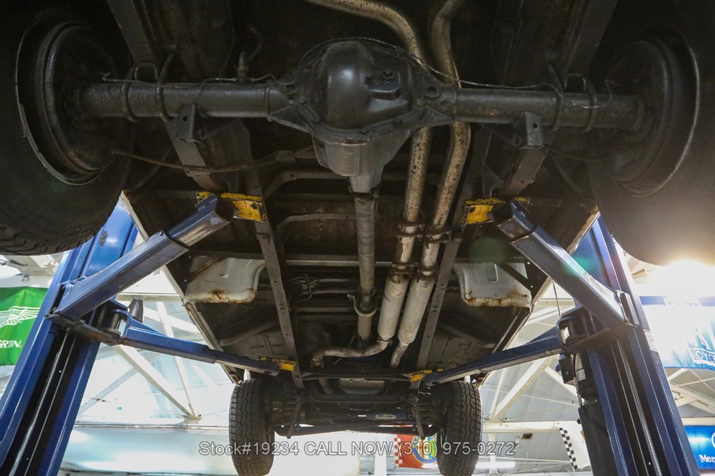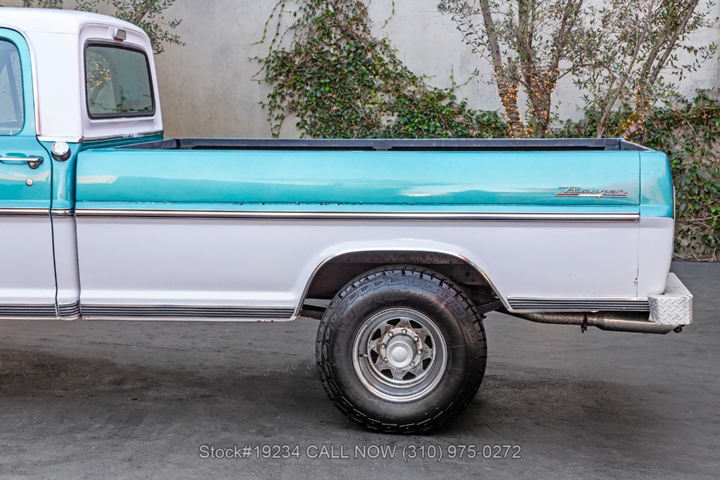 Equipped with an automatic transmission and a capable V8 engine topped with an Edelbrock 4-barrel carburetor. It includes power steering for ease of driving, along with drum brakes on all four wheels. Exterior styling features include distinct "Ranger" badging, chrome trim, chrome bumper, 15-inch steel wheels, and Ironman tires. Inside, convenience features include a comfortable bench seat, lap belts, an aftermarket center console, a glove box, an analog clock, and a fender-mounted antenna.