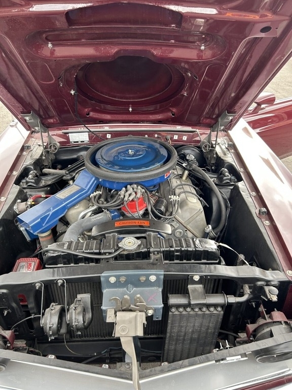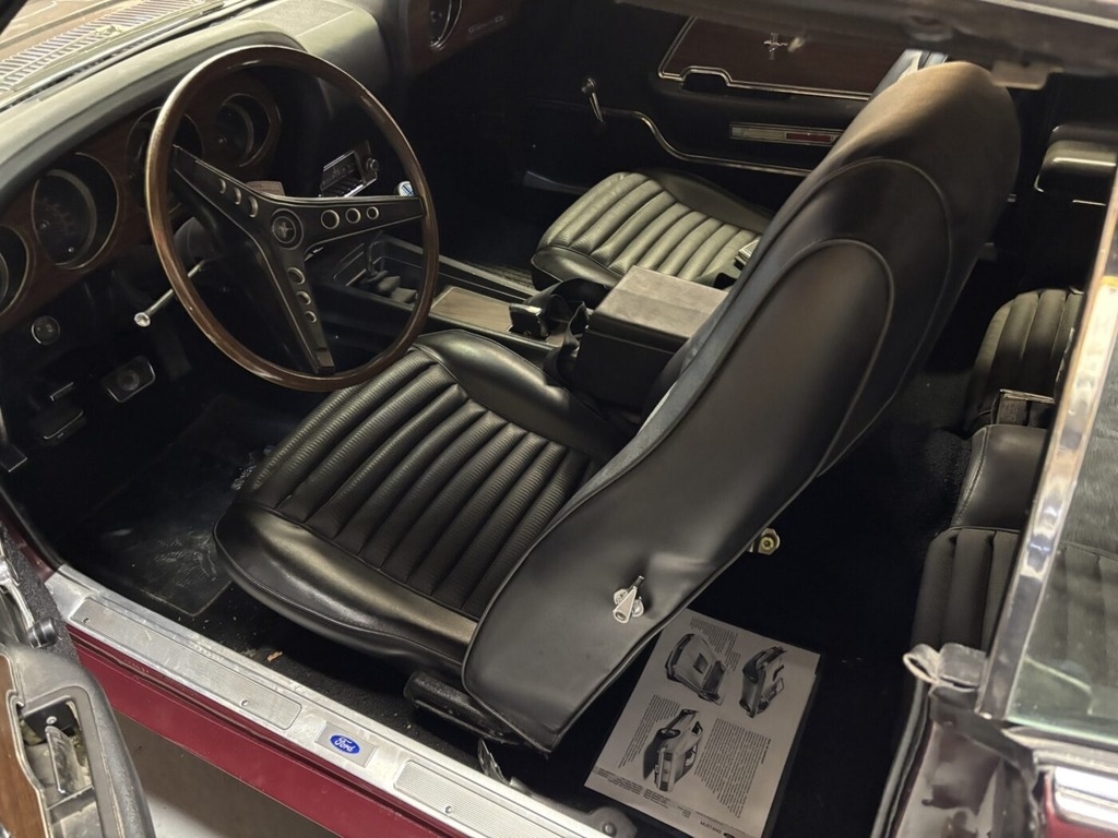 This Ford is powered by a big block 429 engine paired with a 4-speed manual transmission. The odometer reads 52,000 miles, and it is shown with a Royal Maroon exterior and a black vinyl interior. This vehicle has been garage-kept and well-maintained.