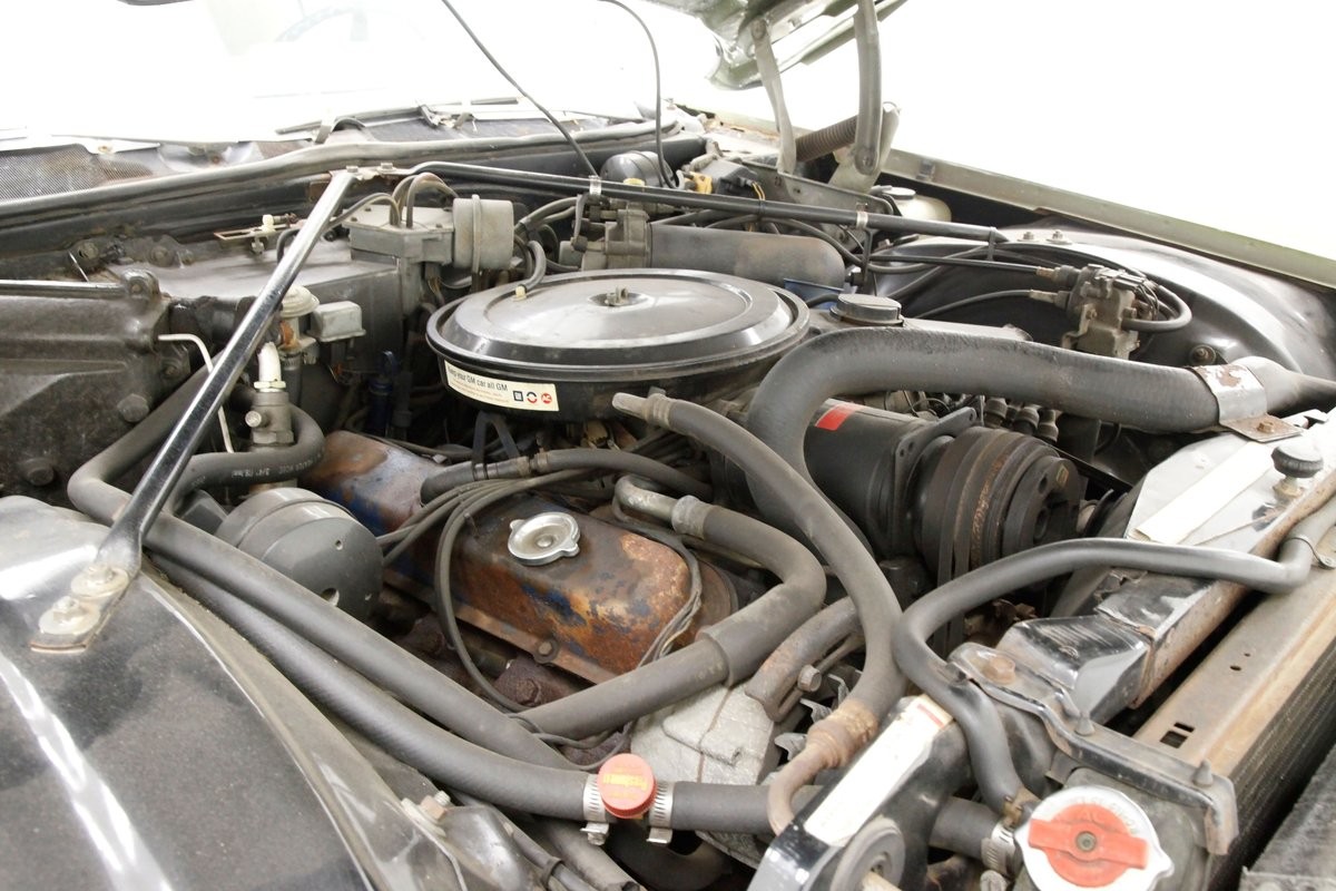 Seated in what appears to be an unrestored engine bay, the a 472ci V8 with a 4 barrel carburetor, and attached to a 3-speed TH400 automatic transmission, shifts smoothly, and even saves gas.... as if you care! On the back is a 12 bolt 2.93 rear axle. Some rust is open the valve coverings and the entire engine bay has patina surfaces.
