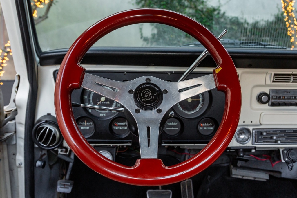 Inside, the cabin features a bench seat, lap belts, air conditioning, a glove box, three-spoke steering wheel, Delco push-button radio, and a fender-mounted antenna, all contributing to a period-correct and functional interior.