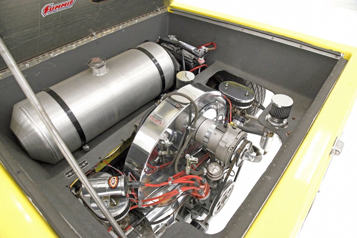 Heavy and thick molded fiberglass in the form of a shell and tub for some interior seats and makes up this simplified body with floating fenders. Headlights, like bug eyes, protrude upwards from the inner fenders right next to the hood and a Mercedes-esque grille floats up front sandwiched between a faux radiator cap in chrome above and small chrome bumper below. An aluminum windshield frame is ever so slightly raked rearward and supports the front mounting for the yellow bikini top that covers the passengers. The upper body is a screaming yellow zonker and the bottom of the tub is black. The rear of this body is nice and high for the suspension travel and has small oval tail lights within aluminum bezels. Not oft seen is a polished diamond plate bed that when opened reveals the engine, fuel tank and battery. Dual zoom tubes for the exhaust emanating from either side add to the allue and custom look. Overall the yellow paint is in nice shape, however we do note a crack in the fiberglass around the passenger side headlamp and some rough cuts are noted in the edges of the yellow fiberglass body. 14 and 15-inch chrome Cragar SST wheels are on all 4 corners and are wrapped in deep treaded staggered width blackwalls.