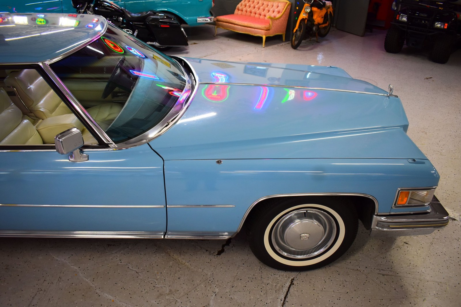 Offered here is a striking 1975 Cadillac Coupe DeVille, finished in a light blue exterior paired with a white vinyl top. The paint presents well overall and gives the car a clean, classic appearance. The vinyl top is intact but does need attention, as the front seam is coming apart and will require restitching. This Coupe DeVille sits on original Cadillac hubcap wheels wrapped in whitewall tires, adding to its authentic '70s appeal. It does have a few minor cosmetic needs, including one non-functioning bright light and a missing rear filler panel, but nothing that takes away from its overall presence.