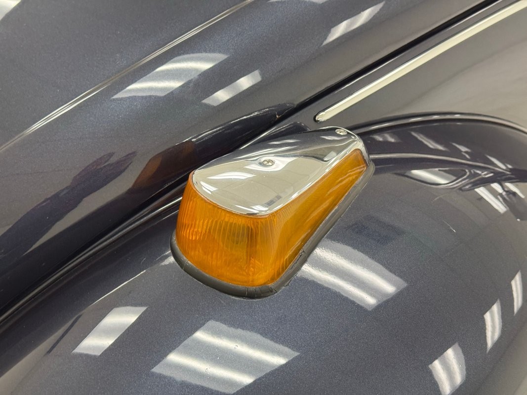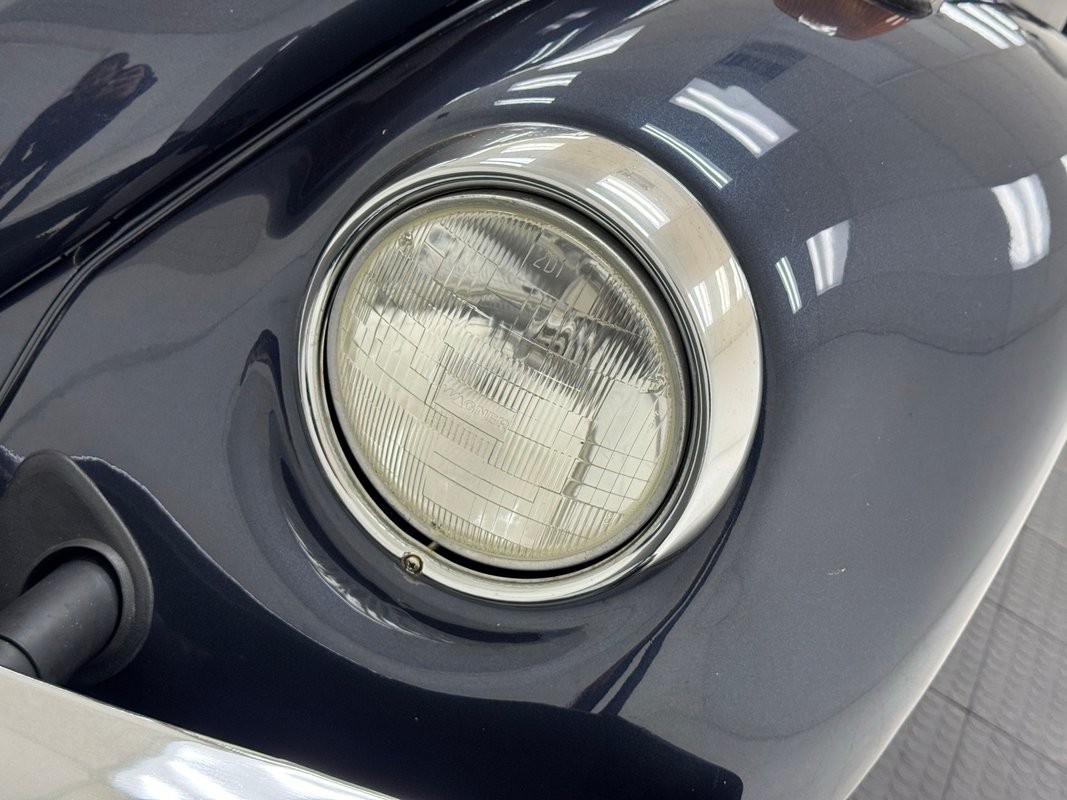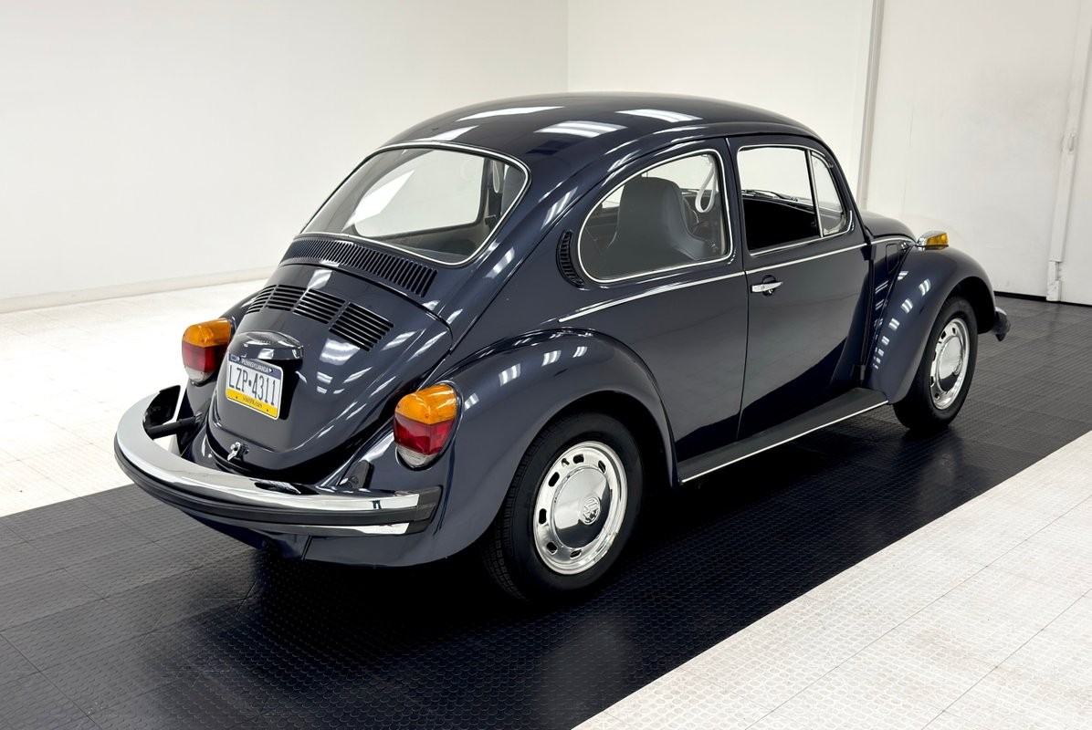 Subtle changes can't be seen on this well proportioned car, but in '75 doors and lights were made slightly larger, and this specimen looks particularly nice in Deift Blue, a darker blue that allows any of the polished trim to shine through, including that line that travels the shoulder and follows the contours on the curved front and sloping rear. From every angle, it's classic Bug, from the louvered rear hatch and rounder bumpers to the fender perched front turn signals and everything in between, so well executed that it's become one of the most popular automobiles in history. VW stamped hubcaps top 15-inch wheels with 165/80R15 tires that have an early 2025 date code under flared fenders that are connected visually by the distinctive, rubberized running board. Imperfections are few, with several areas where we find bubbles, and a touched up chip and scratch.