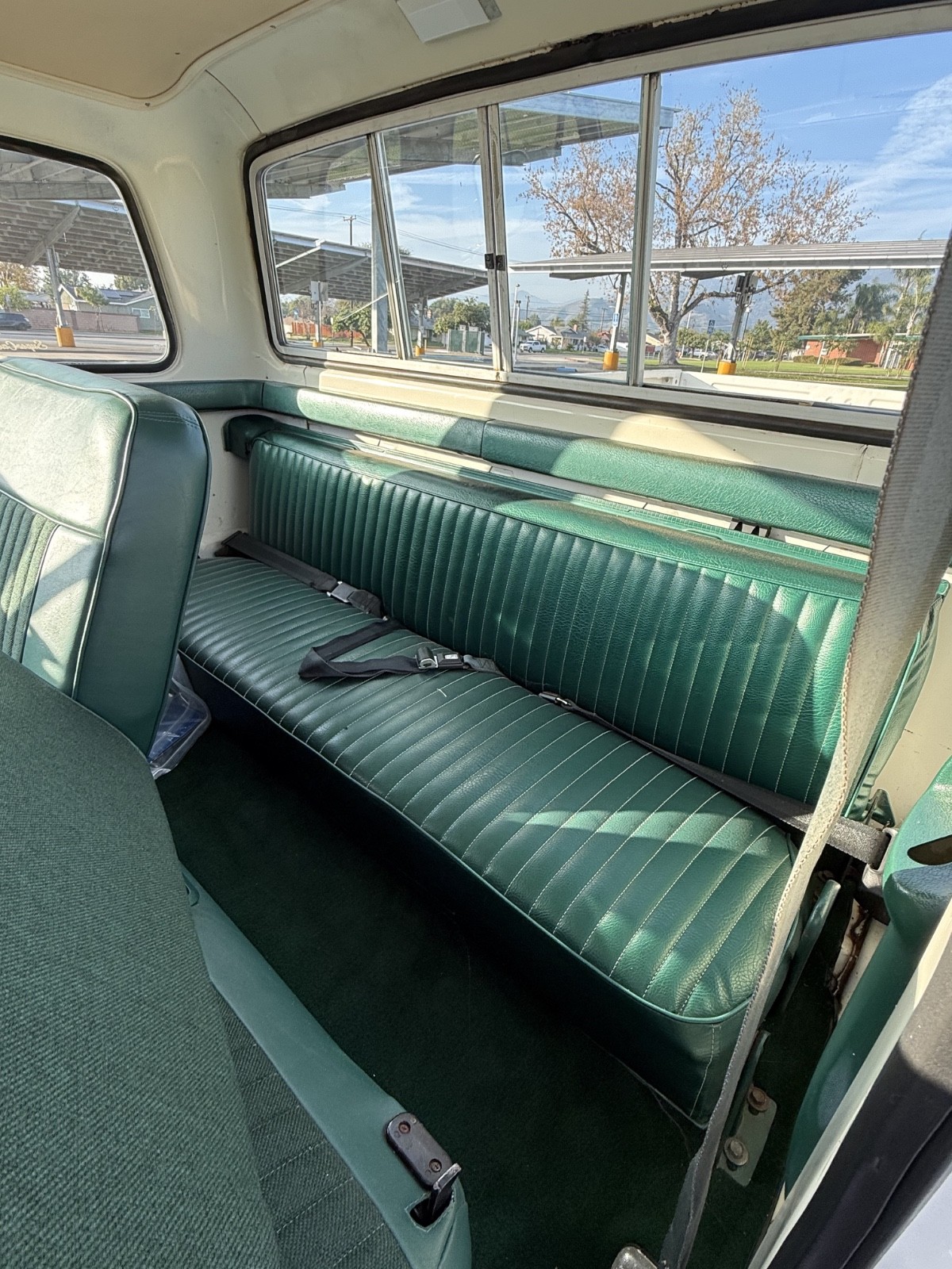 California. There is no rust underneath the vehicle. The only rust are the tiny paint spots, that's it. Very clean body and good original paint, though the paint is a little thin on top of the hood, but still very presentable. The green interior is in excellent condition, the green carpet is new, the front seat has been reupholstered and it looks essentially new, the rear seat has the original green vinyl on it, also like new. The headliner is in good condition. All new tires, less than 300 miles on them. Major service done, new hoses, wires, plugs, points, condenser, cap, rotor, air filter, rebuilt carburetor, fuel pump, both new gas tanks, complete brake rebuild. The radio works. The AC was cold but not anymore, may require a recharge.