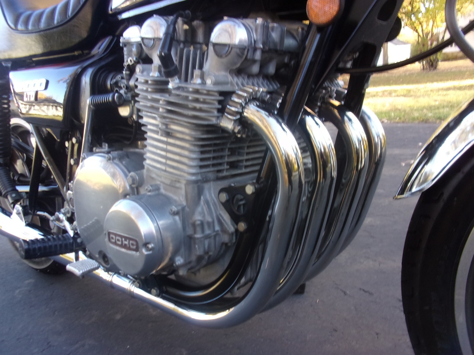 Original Midnight Blue paint looks and shines like new with no damage ever. Best factory paint and decals I have ever seen on these bikes and gas tank is perfect with no dents, dings, scuffs or marks and inside is all shiny metal with no rust ever. No sun fading on tail cowl and side covers are perfect. All the chrome shines like new with no dents, dings or rust pitting. Seat is like new with no damage or rust on the pan. Original Jardine pipes still shine perfect with no dents/dings/scuffs or marks and no holes. Still has the factory Mulholland shocks with no rust and stickers still visible at the bottom. Side covers on engine are nice and bright and factory finish looks great with no scuffs or scrapes. No broken or cracked engine fins. Forks looks great with no leaks. Still has the factory grips too. Right hand controls has been touched up in a few spots as some of the Black wore off due to the master cylinder (common on these). Everything works and has a plug for a battery tender.