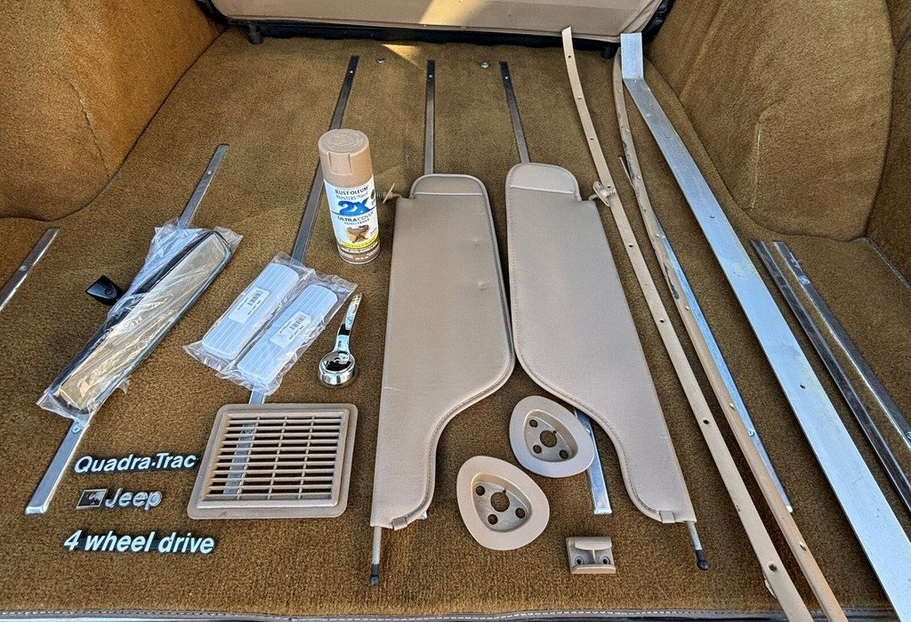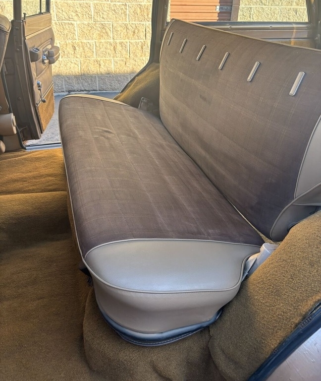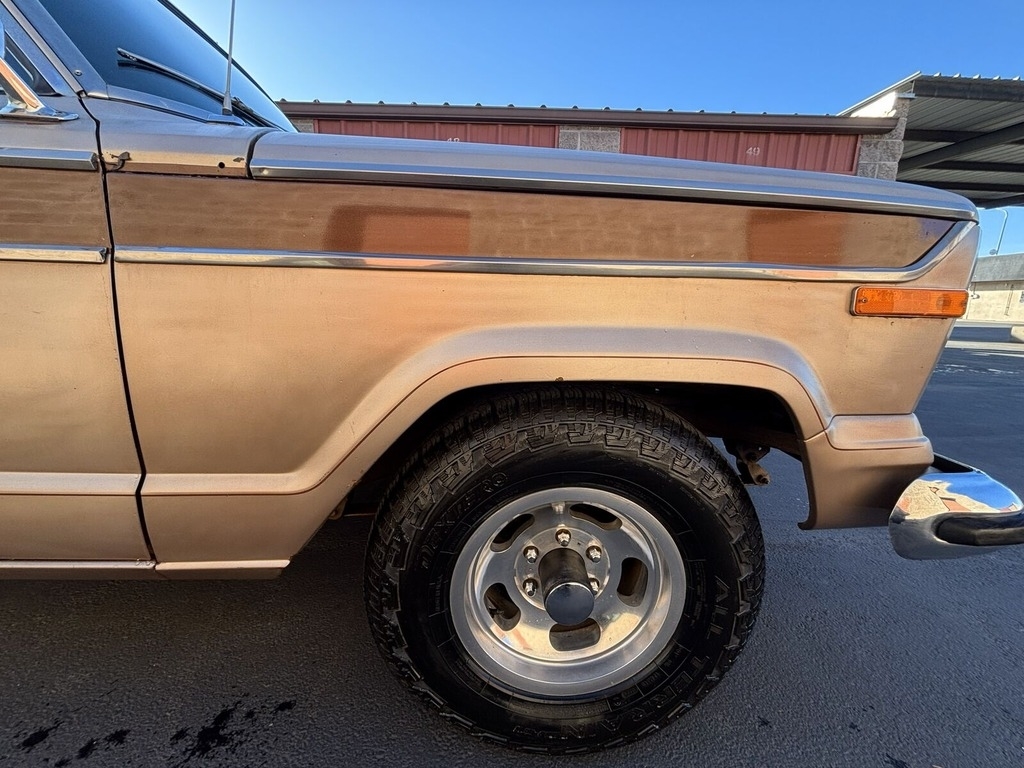 The 1978 Jeep Wagoneer comes with a rare 401ci (6.6l) motor featuring forged steel crank and rods, coupled with a TH400 HD Auto Transmission. It includes Quadra-Trac (Borg Warner) full-time 4x4 with a Low Range option for superior driving performance. The vehicle is equipped with power steering and power front disc brakes for enhanced driving comfort. A factory-installed air conditioner keeps the interior cool while the power tailgate window adds to the convenience. The Wagoneer boasts a factory 40-channel CB radio, factory forged slotted aluminum mag wheels, a towing package, bucket seats, and a sport steering wheel with a tilt feature. Additional enhancements include cruise control, a roof rack, chrome mirrors, rear window defroster, bumper guards, and a convenience group. It was originally Loden Green Metallic and has been repainted in Golden Ginger Metallic with custom pinstriping. The Brampton Plaid fabric seats are adorned with Wellington vinyl trim. This vehicle features a new fuel tank, lines and pump, and a new carburetor. Essential components such as belts, hoses, filters, plugs, distributor cap, and rotor, as well as a thermostat and housing, battery, and electronic ignition module have all been replaced. Fluids, including coolant, motor oil, differentials, transmission, and brake fluids, have been changed. The tailgate motor, track, channel, felt, and gear assembly are brand new. The valve cover and intake gaskets, master cylinder, brake pads, and shoes have also been replaced. A new OC full carpet kit in saddle color has been installed, along with a matching headliner kit (new in box). Additionally, the Wagoneer includes some extra new and original parts, as well as a Poppy’s Patina Clear Coat Kit (new in box). The tires are in good condition, and the vehicle starts, runs, and drives with all lights and signals functioning. The odometer works with accurate mileage, while the wipers are functional. However, the A/C has a hose leak, and the speedometer is currently non-functional. The glass is entirely original, with a few minor marks on the windshield. There is minor rust over both rear wheel wells, but the rockers and floors remain solid.