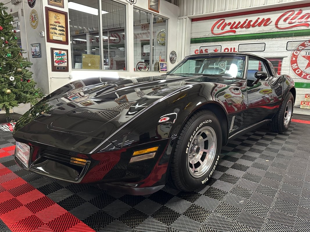 This 1981 Corvette is a strong example of the last carbureted C3, and it presents very well for its age. The car has been resprayed in gloss black with white pinstriping, giving it a clean, classic look. It rides on its factory aluminum wheels wrapped in BFGoodrich Radial T/A white-letter tires, which suit the car perfectly. The glass mirror T-tops are in great condition; the pop-up headlights operate as they should. All exterior lights work properly, and the chrome exhaust tips finish it off nicely.