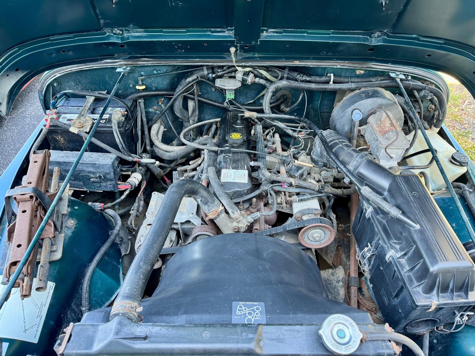 The solid exterior is finished in a beautiful Emerald GreenMetallic that changes based on sun/shade exposure and compliments the black hardtop. Black nerf bars and 31X10.5" General Grabber AT2 tires wrap around vintage Centerline Alloys for an appearance that's both on and off road ready. There is even a hitch for a small trailer to be towed with you!