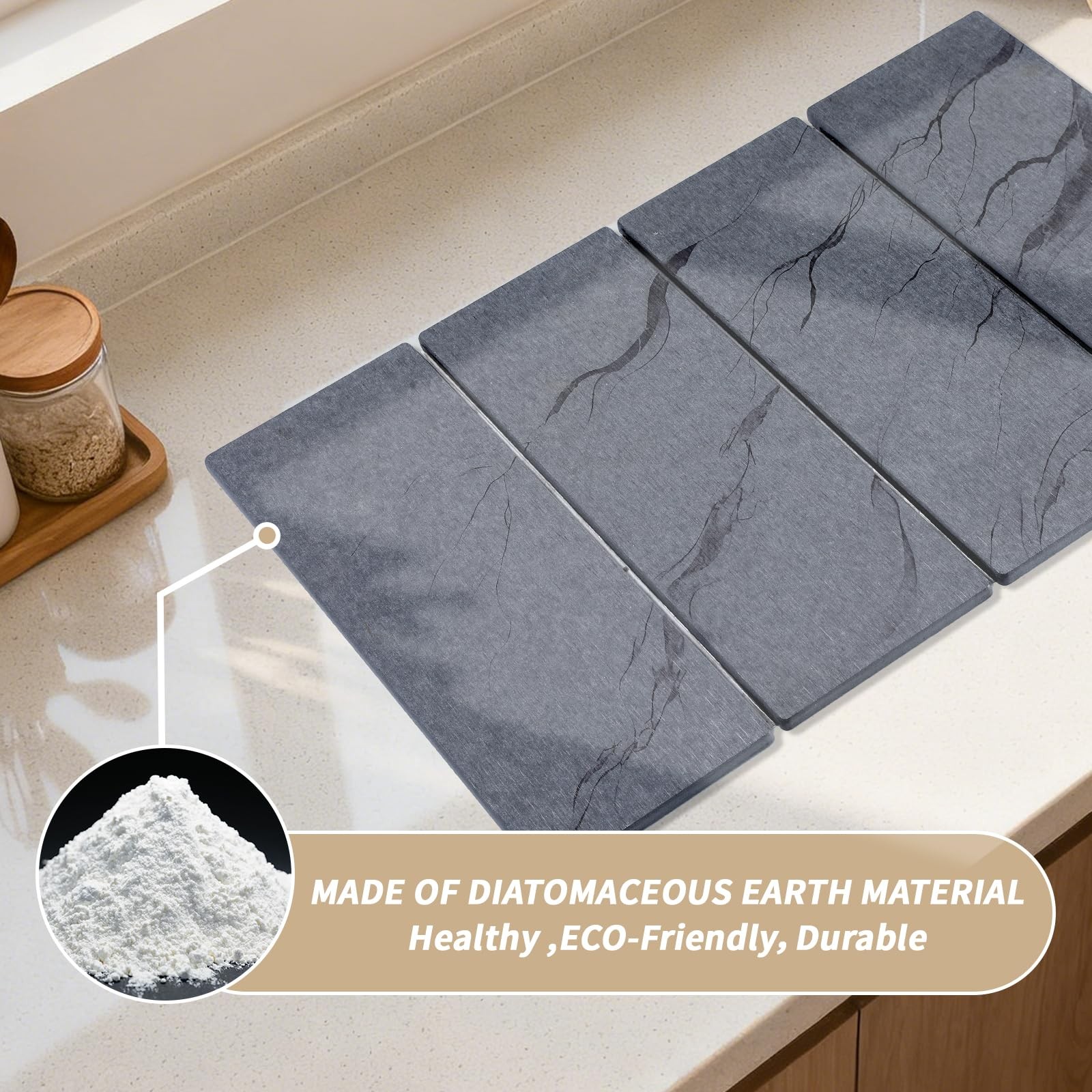 Fashionable Modern Style: The appearance of this diatomaceous earth absorbent drying mat adopts a fashionable modern design, with a gray surface combined with elegant marble patterns, which can perfectly adapt to modern home kitchen countertops. Add elegance and fashion to your kitchen, enhancing overall aesthetics.