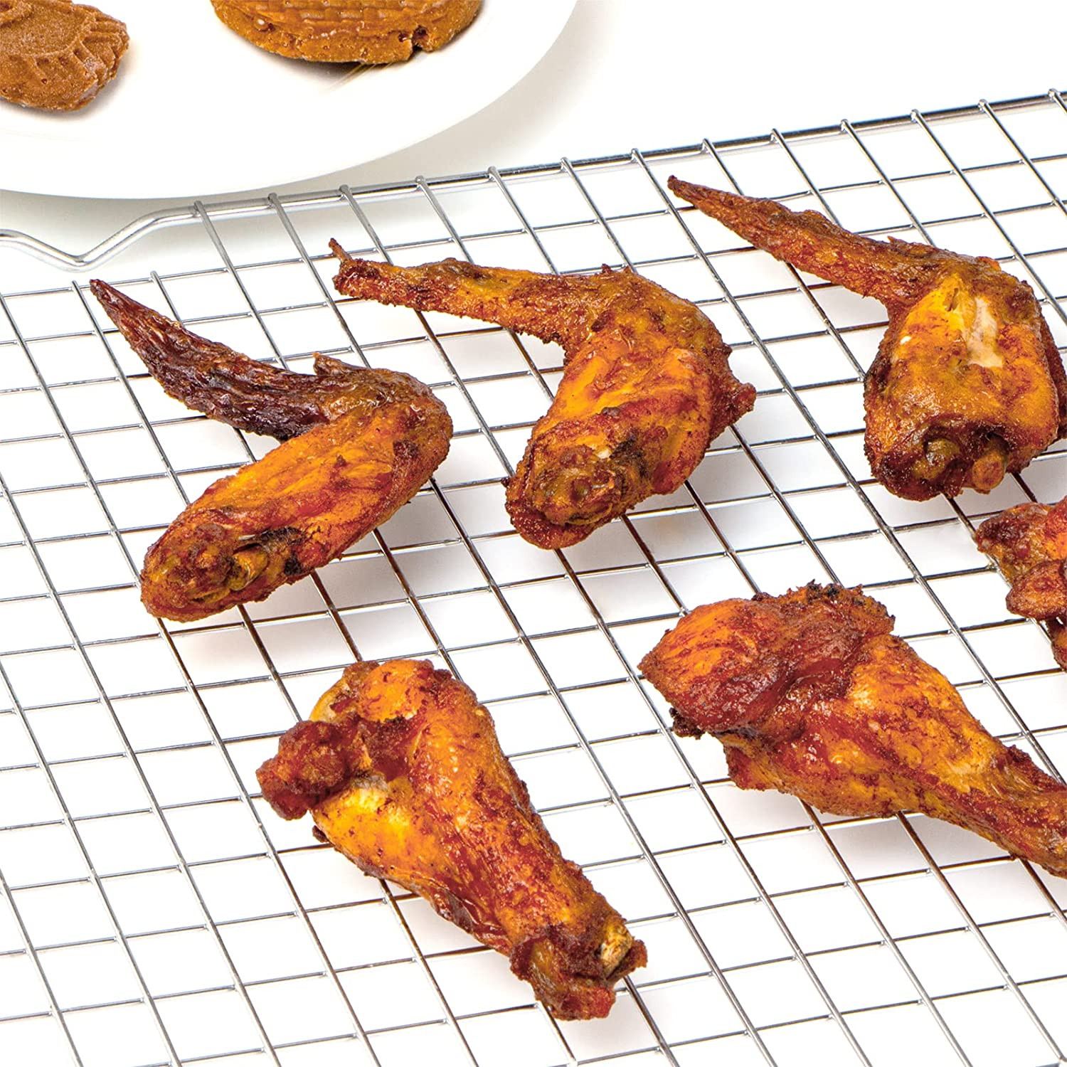 High temperature resistance, suitable for use in the oven or grill. Put the grill rack on a biscuit board as a drip tray, roast fat out of the food, allow you to make a crispy crust on chicken wings, turkey or bread