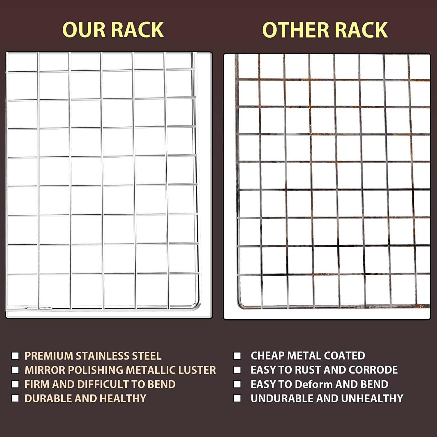 Briout stainless steel racks 2 piece of set, have sturdy construction with thick rods for resisting warp or rust. Not only are they great for baking and cooling baked goods, but they're also great for roasting, grilling, and outdoor bbq.
