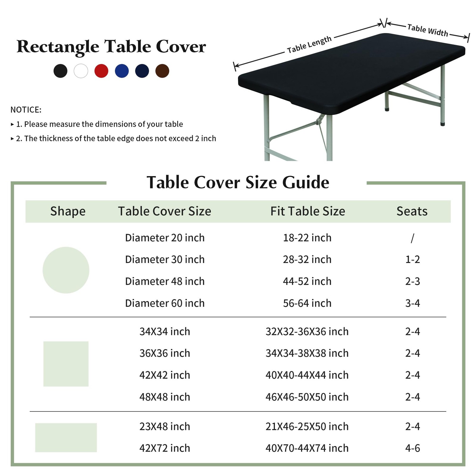 Size Guide: 2 PCS rectangle elastic tablecloths, NOT TABLES. This black elastic table cover measures 24X48 inches, suitable for rectangle tables 22X46-26X50 inches whose thickness is less than 2 inches. Table types for reference are kitchen tables, dining tables, garden tables, banquet tables and other indoor or outdoor tables