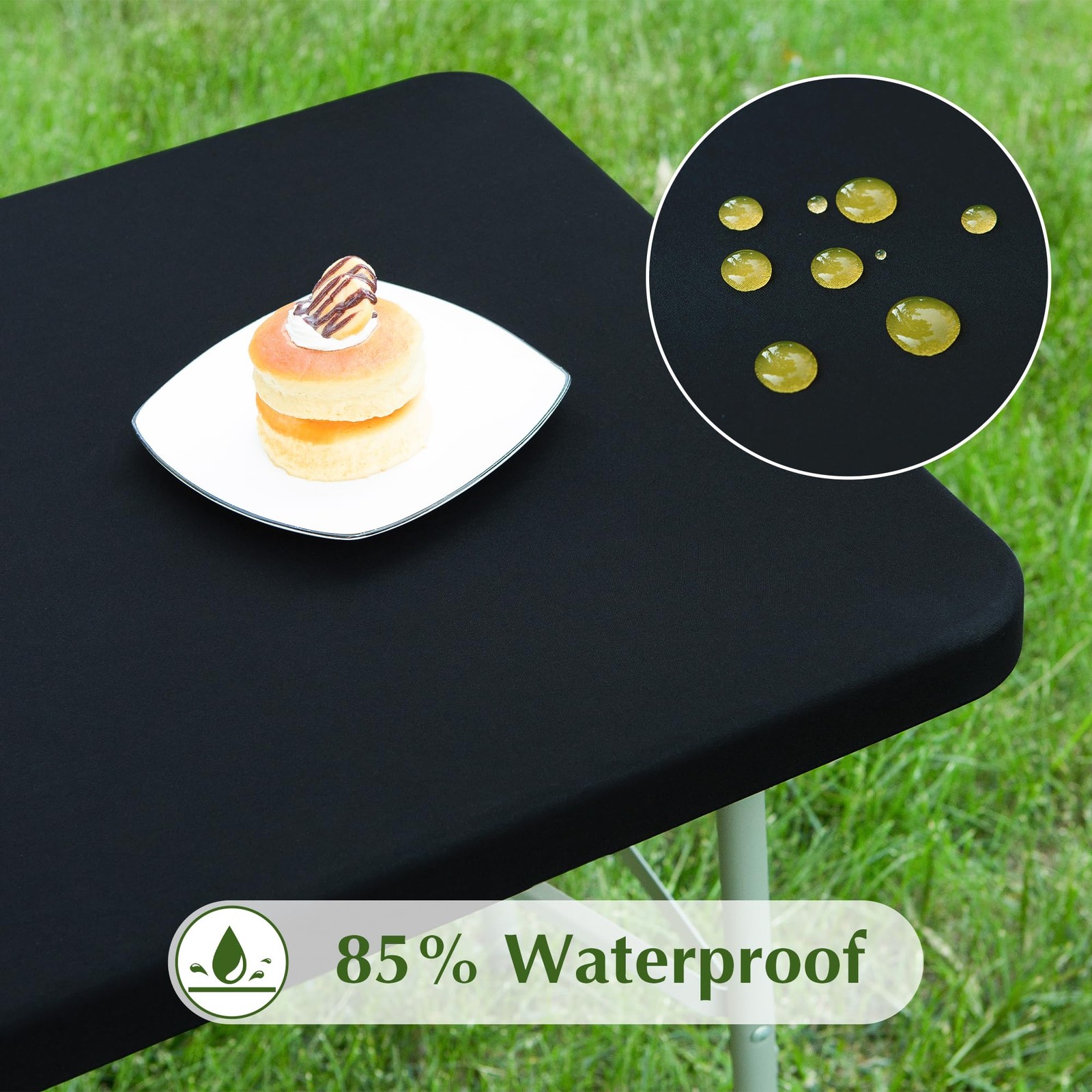 Quality Materials: This black fitted table cover is made of spandex and polyester, NOT VINYL, so it is not completely waterproof. But it is specially treated to be 85% waterproof. A gentle rub with a napkin and the water disappears. Please do not wipe too hard or too late, or the water may infiltrate the table. In addition, The card table covers are soft and stretchable