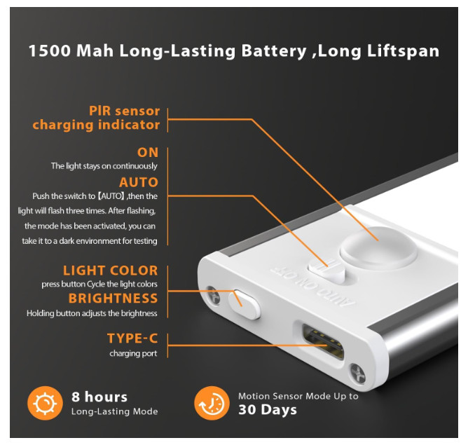 USB Rechargeable & Energy Saving: LED cabinet lights have a built-in large rechargeable battery, it can be quickly charged via USB-C cable. And closet lights battery operated can work for about 30 days in motion sensing mode without frequent recharging. In addition, the under counter lights for kitchen can be set to the always-on mode and illuminate continuously for about 8 hours at 100% brightness, as a work light