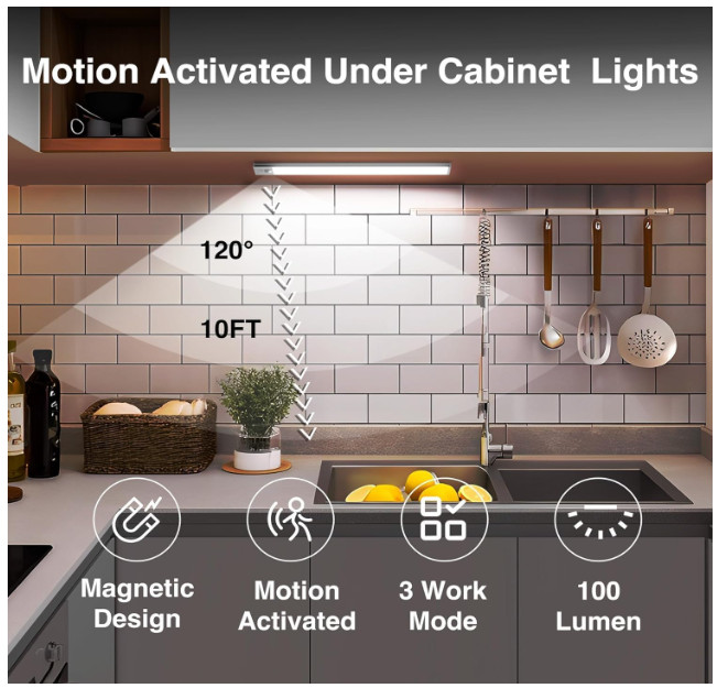 Upgraded Motion Sensor Lights Indoor: Setting the under cabinet lights on motion sensor mode, they instantly auto-on when detecting human movement within 10ft/120° in a dark or low light environment, and auto-off after about 20 seconds of no motion detected. No need to worry about tripping over steps in the dark anymore