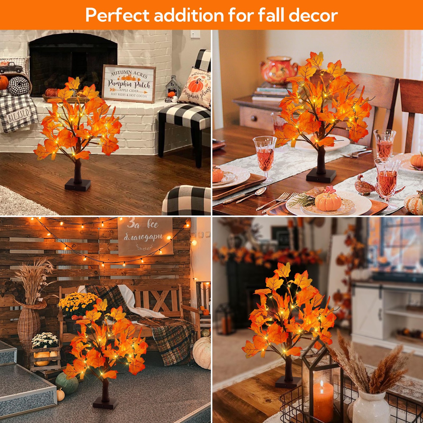 【Fall Decor Lighted Maple Tree】 An artificial pre-lit fall maple tree standing 20.5 inches tall, with a stable 3.94×3.94-inch square base. It features 24 warm white LED bulbs and 48 orange maple leaves (with eco-friendly brown tape), adding a cozy vibe to any space. Ideal for fall and Halloween.