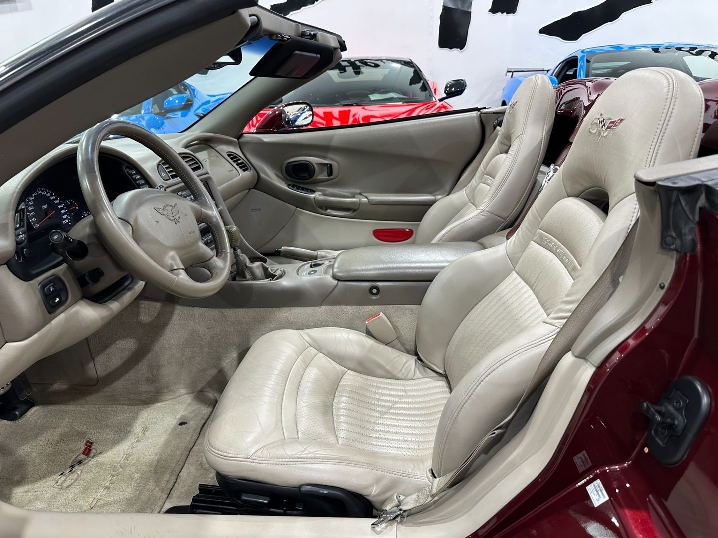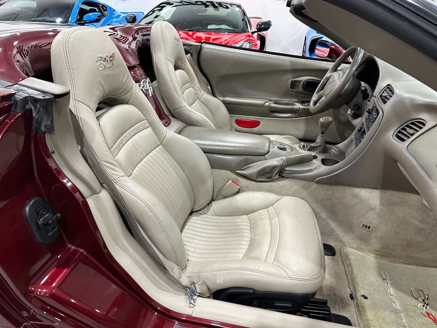 The 2003 Corvette 50th Anniversary Convertible celebrates five decades of performance heritage, blending iconic styling with modern engineering. It features the special Anniversary Red Metallic Paint, unique Shale Leather Interior, and advanced Magnetic Ride Control, making it one of the most refined and collectible models of the C5 generation.