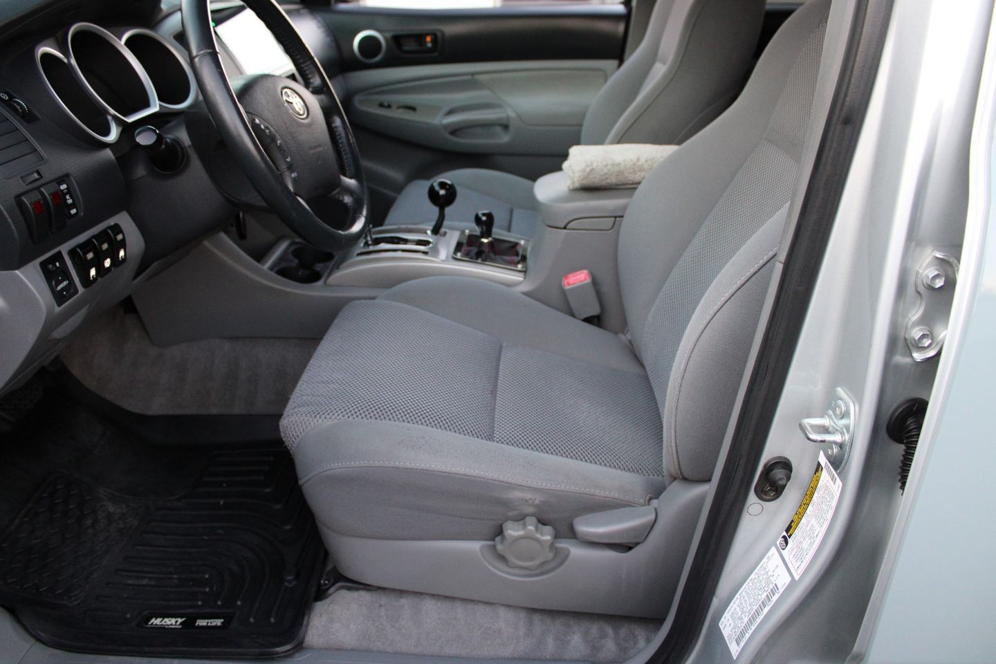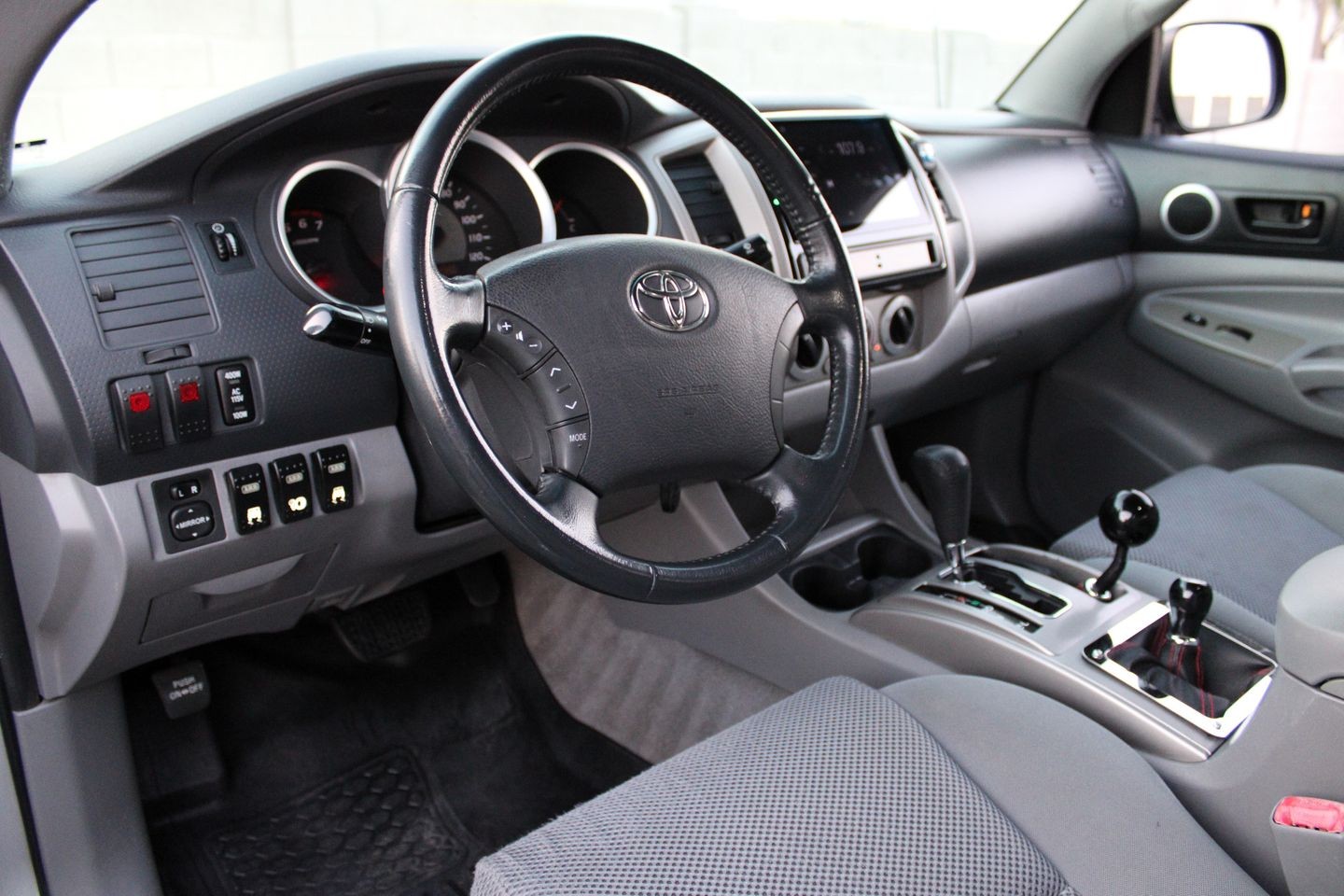 The exterior of this Tacoma is cloaked in a sophisticated gray finish, a color that not only exudes a timeless appeal but also offers practicality by showing dirt and scratches less noticeably--perfect for those who love to take their truck off the beaten path. The Tacoma's design is both functional and stylish, with a stance that commands respect and a profile that hints at its adventurous spirit.