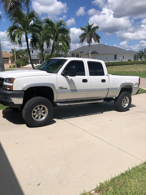 The truck is a 2006 Chevrolet Silverado 2500 K2500 HEAVY DUTY with a gray interior color and white exterior color. It has a 6.6L Diesel V8 engine with more than 185 kW of horsepower and 8 cylinders. The vehicle features a crew cab pickup body type and comes with power windows, climate control, CD player, cruise control, and other convenience features. It also includes safety features such as driver and passenger airbags, anti-lock brakes, and traction control. With a mileage of 136,100 and a service history available, this Chevrolet Silverado is a reliable and well-maintained heavy-duty pickup truck. Factory installed Fab Tech Lift Kit (2006) , Custom Wheels , Tires less than 9,000 miles Rust free, accident free, Florida truck, single-owner since 2006 .