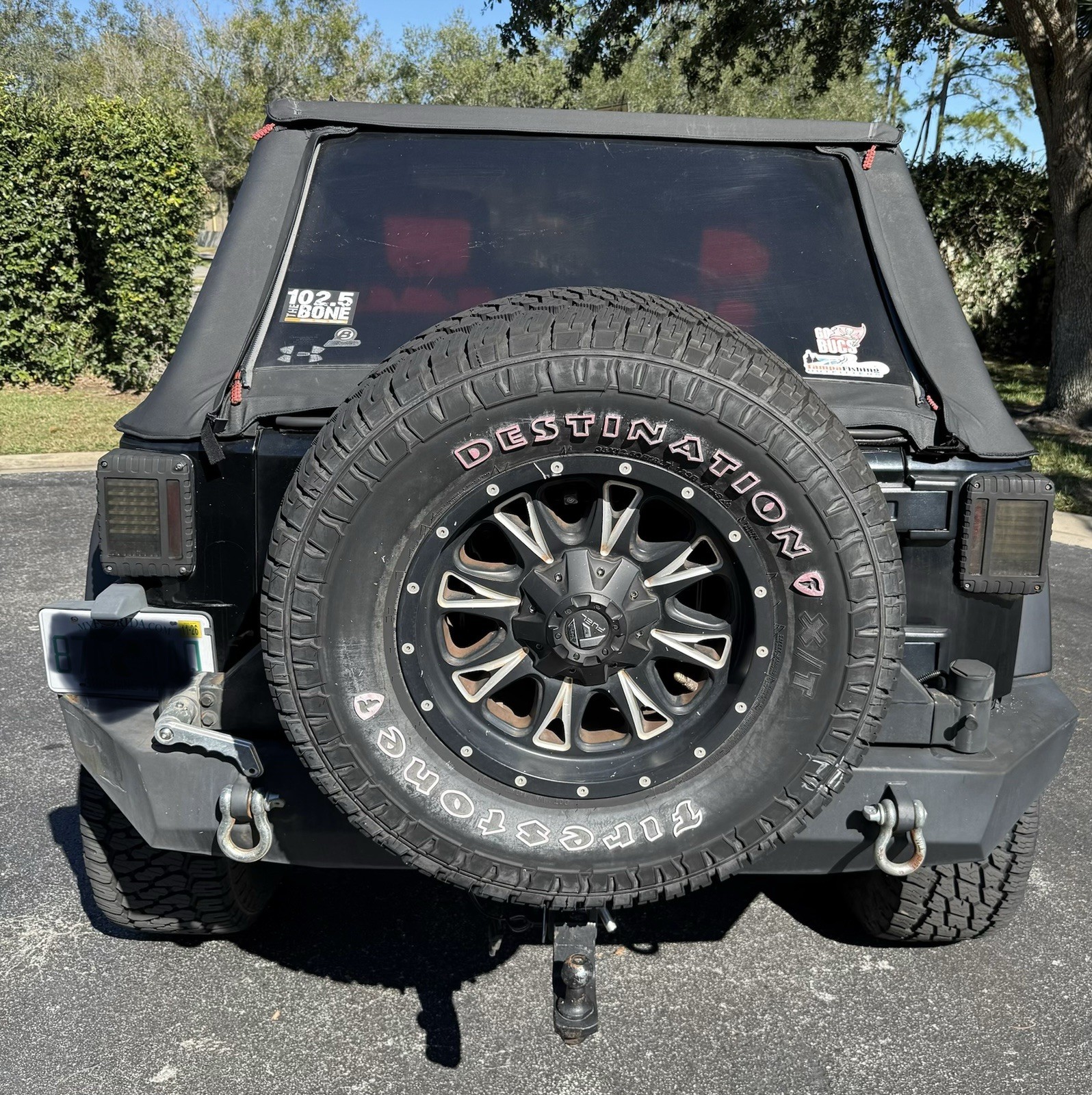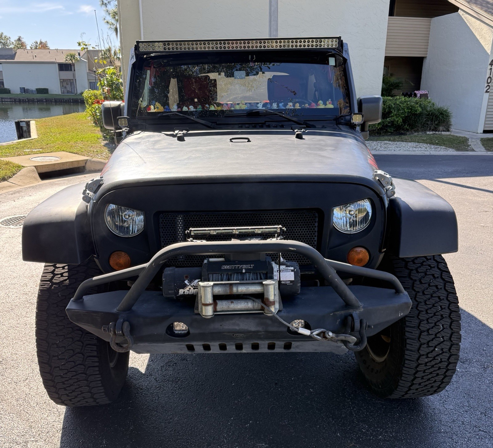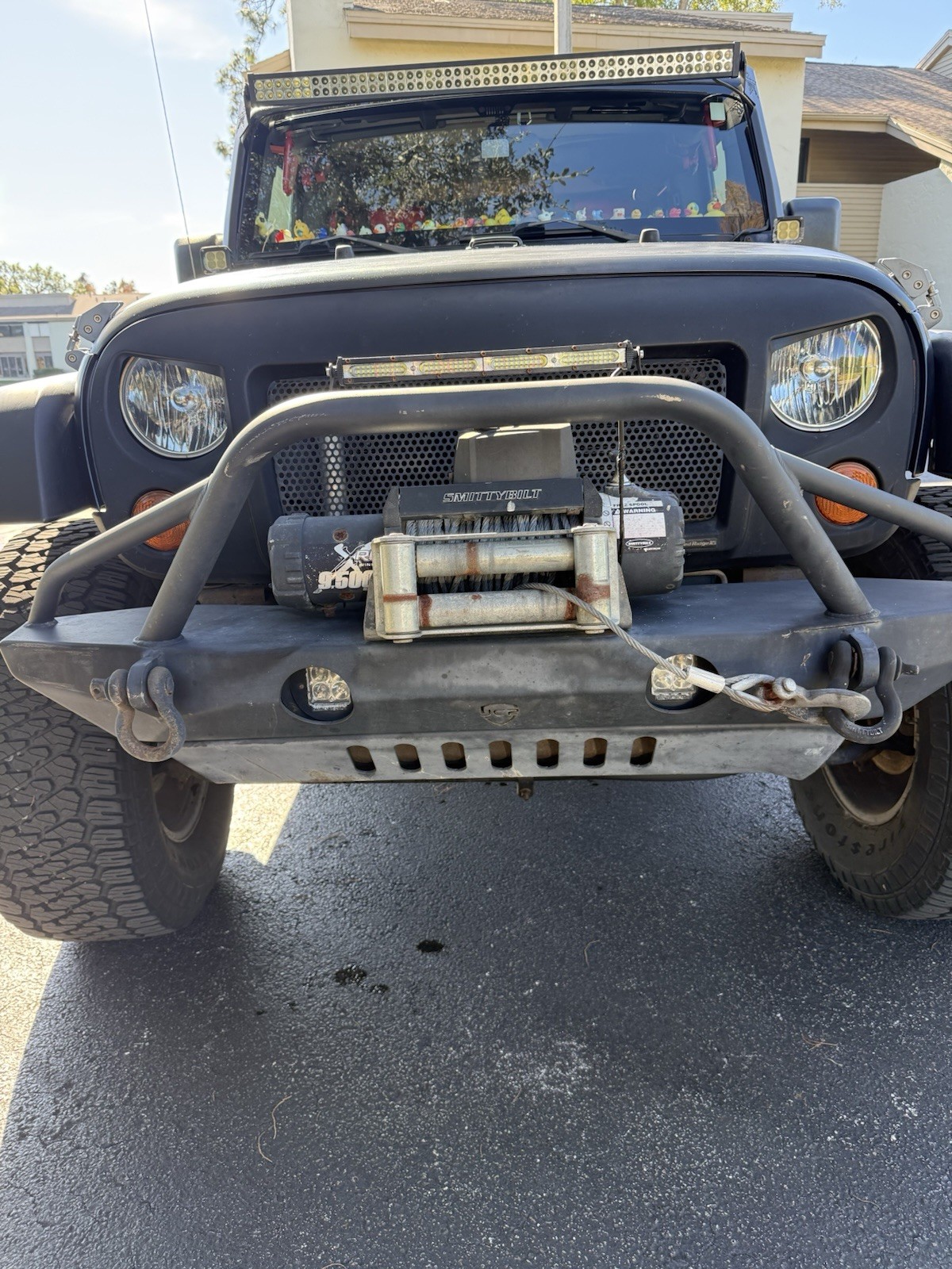 Extras include: 35 inch tires, 3 inch lift, Angry eye front grill, aftermarket front and rear bumpers, front wheel-well cavity-armour, LED lights Roof line, Corner cubes, Top of winch, Running Trail-lights, exterior ground lights, 9,500 lb. Smittybuilt-winch, tow-hooks front and rear; trailer hitch, LED rear lights. Racer back soft top.