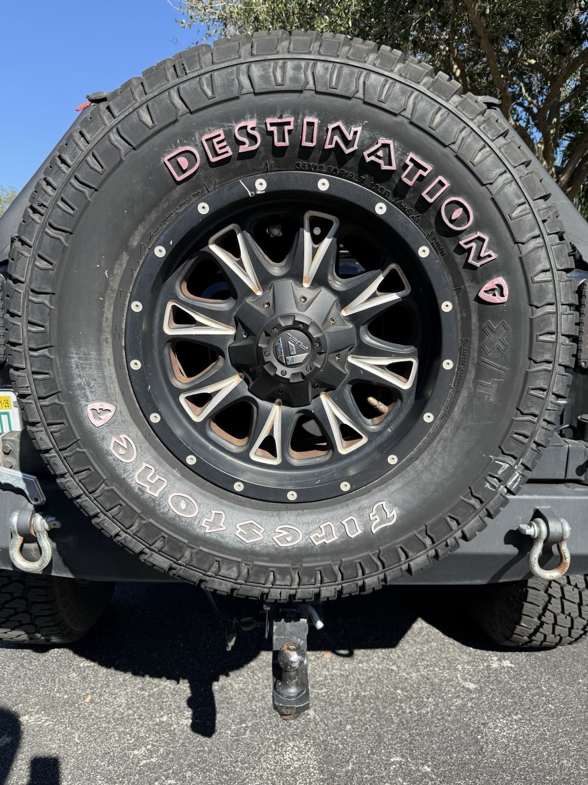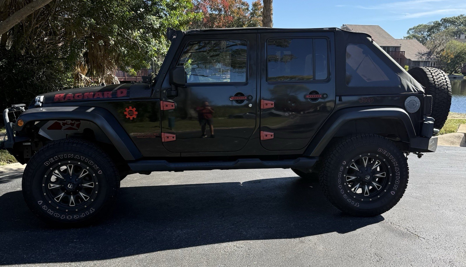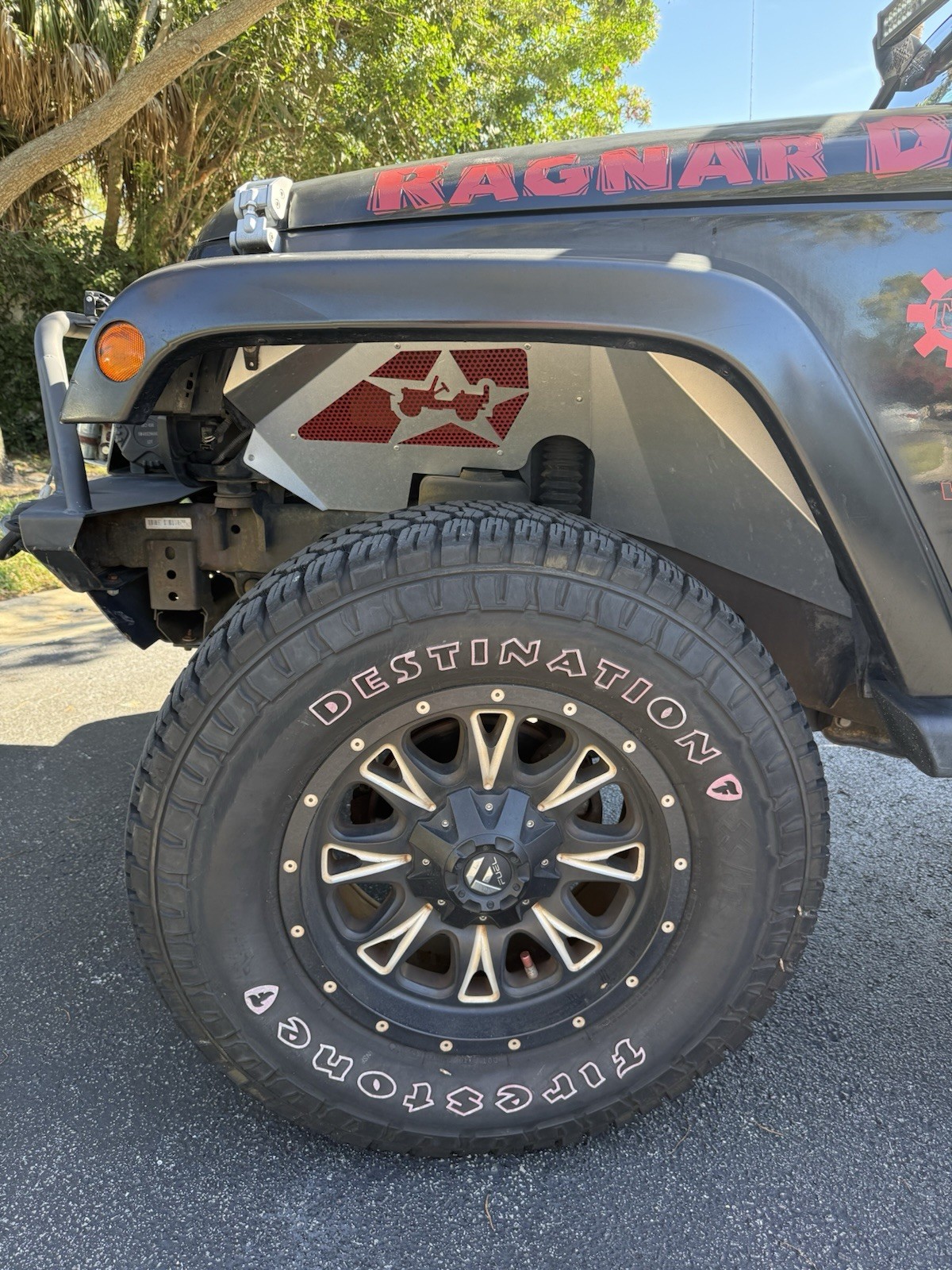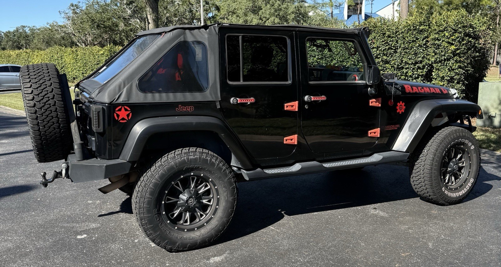 Extras include: 35 inch tires, 3 inch lift, Angry eye front grill, aftermarket front and rear bumpers, front wheel-well cavity-armour, LED lights Roof line, Corner cubes, Top of winch, Running Trail-lights, exterior ground lights, 9,500 lb. Smittybuilt-winch, tow-hooks front and rear; trailer hitch, LED rear lights. Racer back soft top.